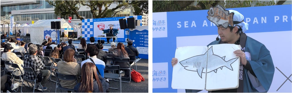会場では、海に精通した多彩なゲストによるステージトークをはじめ、海にまつわる商品の販売や、宮崎に伝わる「海ノ民話」のアニメーション上映を実施。あわせて、「海と日本プロジェクトinみやざき」の10年にわたる歩みを振り返るパネル展示を行いました。