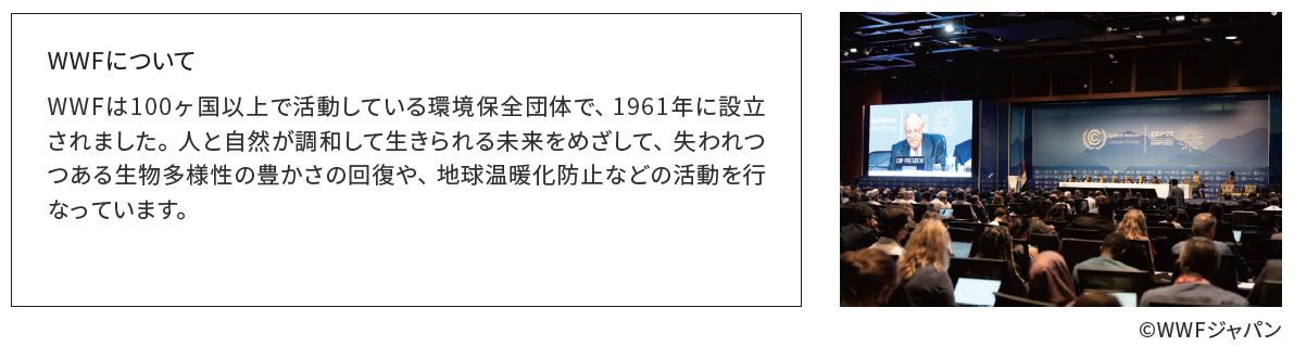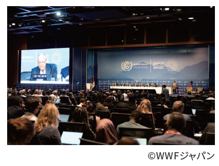 洪水、干ばつ、台風の大型化など、温暖化はすでに地球規模の環境問題として脅威を広げています。この問題に対応するには、世界の国々が協力して、その原因となっている温室効果ガスの削減と、温暖化の影響に対する「適応」に取り組まねばなりません。WWFジャパンはWWFの国際的なネットワークの一員として、主な国際交渉の舞台である国連の気候変動枠組み条約の締約国会議(COP)に参加。国境を越えた立場から、温暖化の脅威を食い止めるために必要とされる対策や合意を、各国政府に対し求めるなどの活動を行っています。