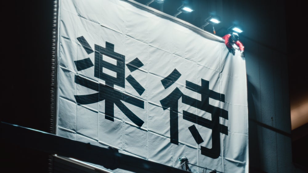 ・渋谷駅近くで実際に行われた看板設置の様子を撮影し、CMに使用