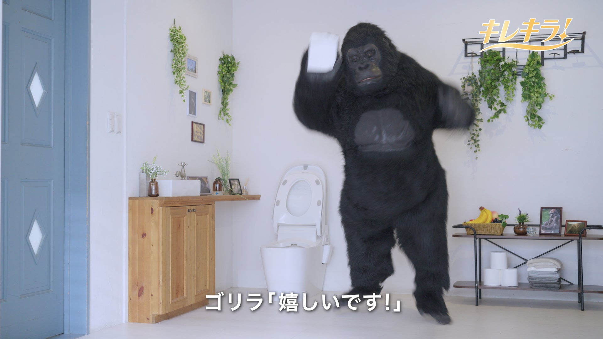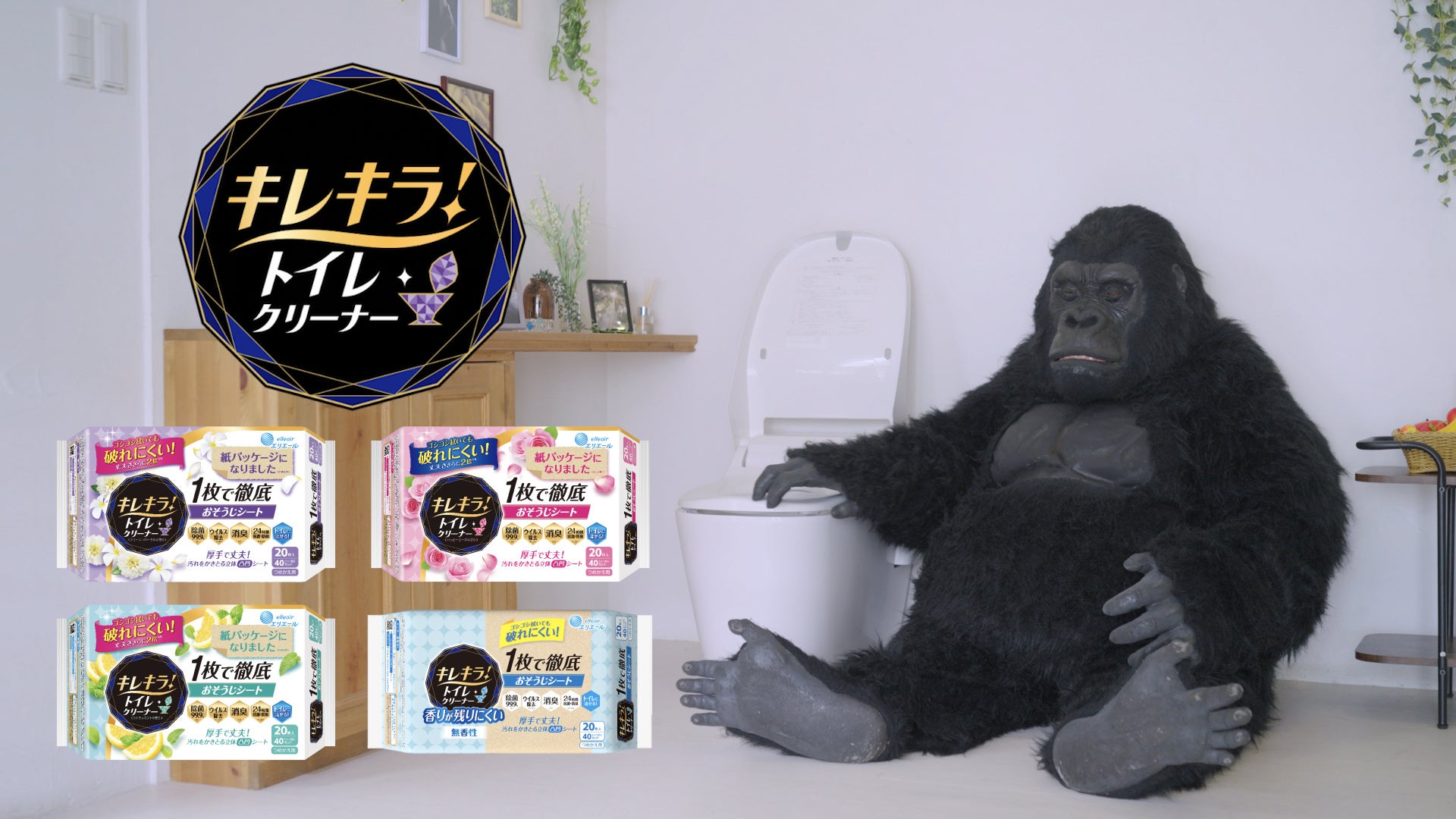 ゴシゴシ拭いても破れにくいことを表現している「キレキラ!トイレクリーナー」のTV CMをパロディにしたWEB CMを公開。ゴリラの着ぐるみが『キレキラ!トイレクリーナー 1枚で徹底おそうじシート』を使ってトイレ掃除をします。