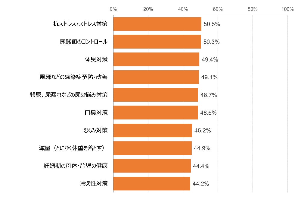 (図1)「コロナ禍中よりも気にするようになったことや、新たに気にするようになったことがあるヘルスベネフィット」の上位10項目