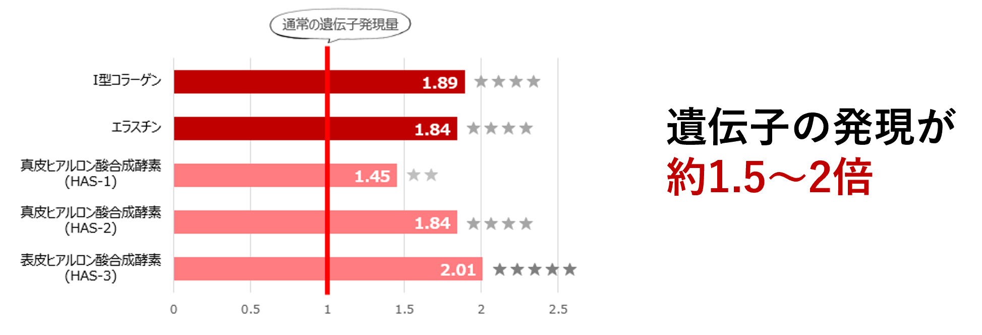 コラーゲン、ヒアルロン酸、そしてエラスチンの遺伝子発現を高めることが確認されました。これは、ハリ弾力に関わる成分を合成してくださいという指令、スイッチボタンが通常より多く押されて、肌内のハリ弾力成分の量を増やします。ハリ弾力に遺伝子レベルでアプローチすることで、内側からふっくらハリを与えます。