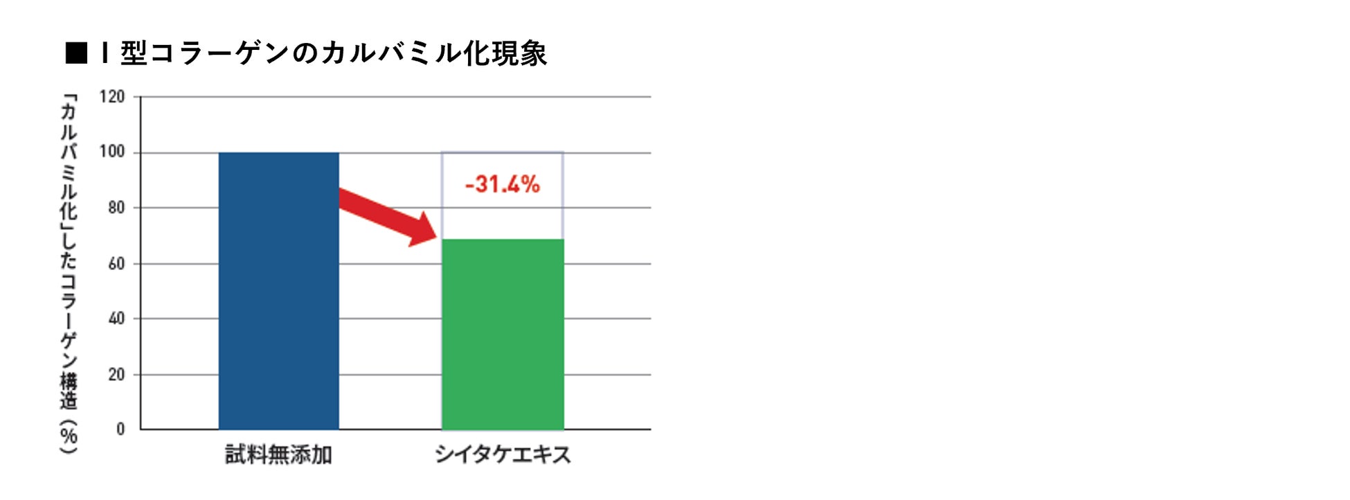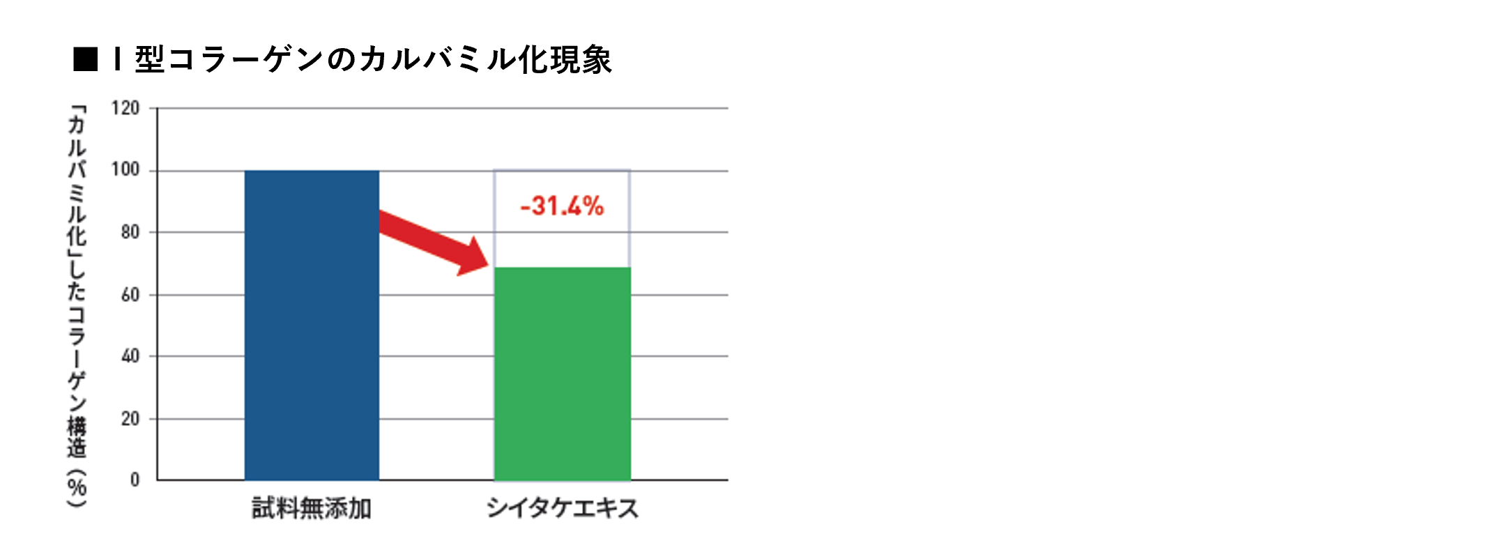 コラーゲンが劣化し柔らかくなる現象「カルバミル化」。浸透型コラーゲンEXに含まれるシイタケエキスがこのカルバミル化を抑えることで、コラーゲンの質を保つことができると確認されました。
