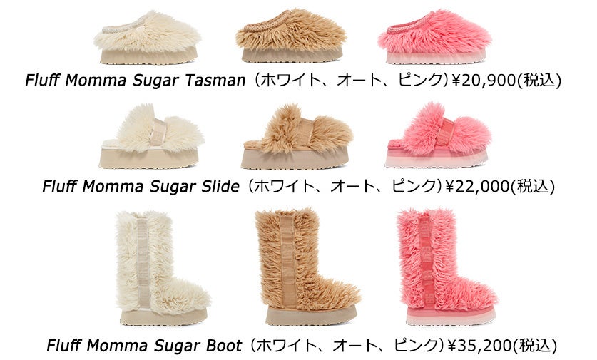 TOKYO (2022年11月16日)– 南カリフォルニアを拠点とするグローバルライフスタイルブランドのUGG (a division of Deckers Brands [NYSE: DECK])は、更なる再生可能な未来を追求するため、より良い素材を探求し使用するというブランドのコミットメントを継続し、植物由来の再生可能素材から生まれたサステナブルコレクションの新作「Fluff Momma Collection(フラッフ モマ コレクション)」を発売します。コレクションは、Fluff Momma Sugar Tasman(フラッフ モマ シュガー タスマン)、Fluff Momma Sugar Slide(フラッフ モマ シュガー スライド)、Fluff Momma Sugar Boot(フラッフ モマ シュガー ブーツ)の3つのスタイルで構成され、カラフルな3色展開。これまでのサステナブルコレクションでも採用されていた、石油由来のエチレンの代わりに再生可能なサトウキビからつくられた素材を使用したSugarSole™のアウトソールと、責任を持って収穫された木から採取した植物由来のTENCEL™リヨセルを使用した贅沢なライニングに加えて、トウモロコシを主原料とした植物由来の繊維Soronaからつくられた新素材のフォーファーが特徴。ふわふわのファーと足を長く見せる約5㎝高のプラットフォームソールが、ボリューミィでインパクトのあるキュートな足元を演出するだけでなく、見た目に反した驚きの軽さとクッション性で、歩きやすく機能性も高いのはUGGならでは。UGGのサステナブルコレクションは、様々な観点で、身に着ける人の心まで「FEEL GOOD」にしてくれます。