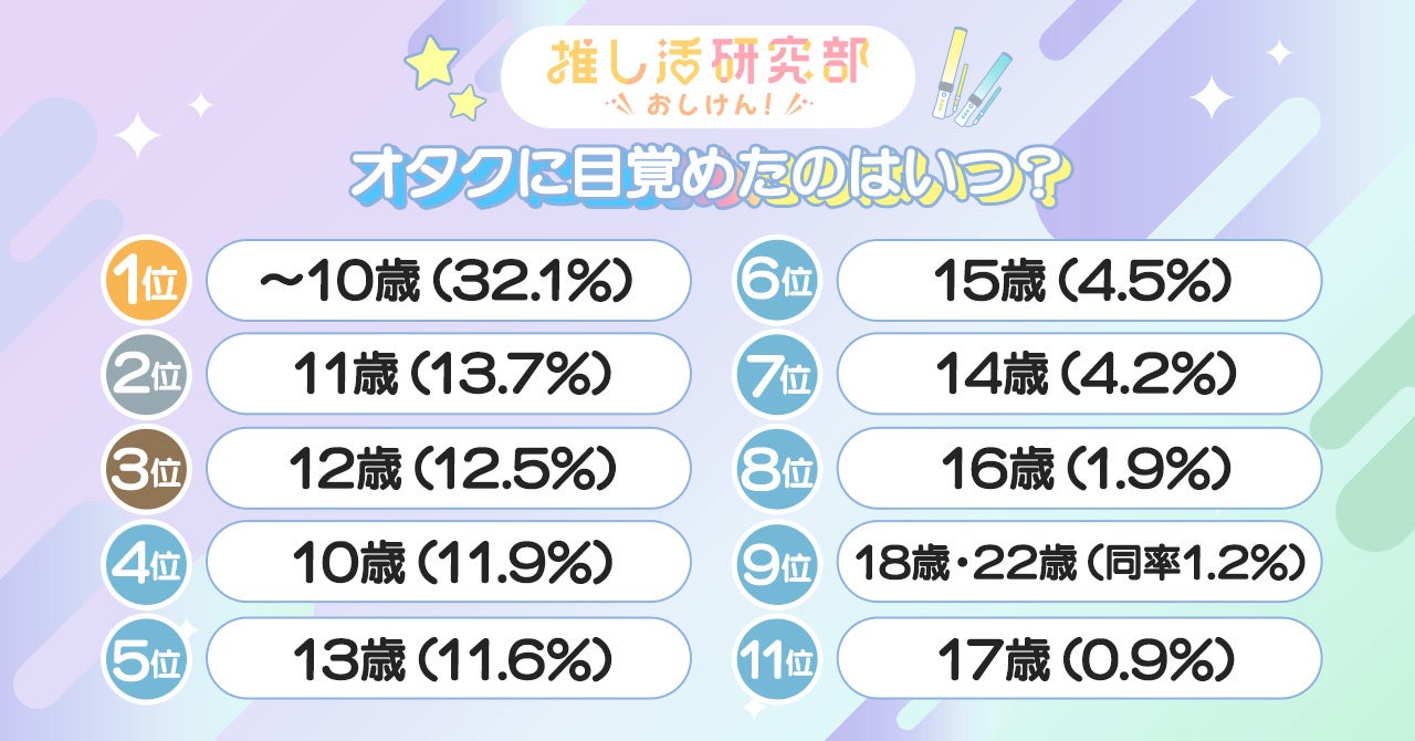 今回のランキングは上位11位までご紹介していますが、それ以外の年代からも多数回答をいただきました。10代以下から50代まで、幅広い年代から回答が集まりましたが、オタクの目覚めは10歳以下から10代前半にかけて集中していることが分かりました。