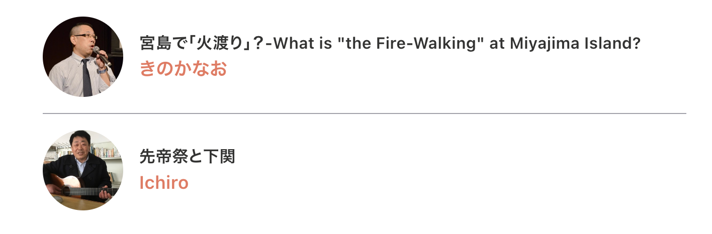 日本語講師2名が春に行われる日本のお祭り、宮島「火渡り」と下関「先帝祭」について日本語/英語でご紹介します。