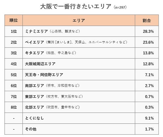 また、4位には大阪のシンボルを臨める「大阪城周辺エリア」(12.8%)、5位には「天王寺・阿倍野エリア」(7.1%)が選ばれる結果となりました。