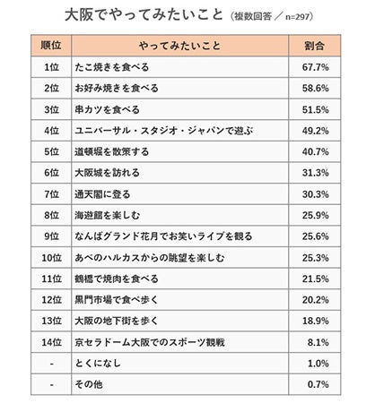 続いて、「大阪でやってみたいこと」についてのアンケート結果を、ランキング形式で紹介します。なお、期間限定イベントでもある大阪・関西万博は、今回は選択肢に入れていません。