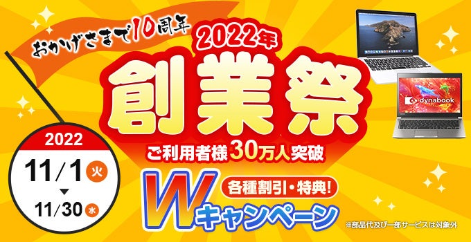日頃のご愛顧に感謝を込めて、運営するパソコン修理専門店「パソコン修理24」にて、「創業祭キャンペーン」を行います。2022年11月1日(火)~2022年11月30日(水)の期間限定です。お気軽にお立ち寄りください。