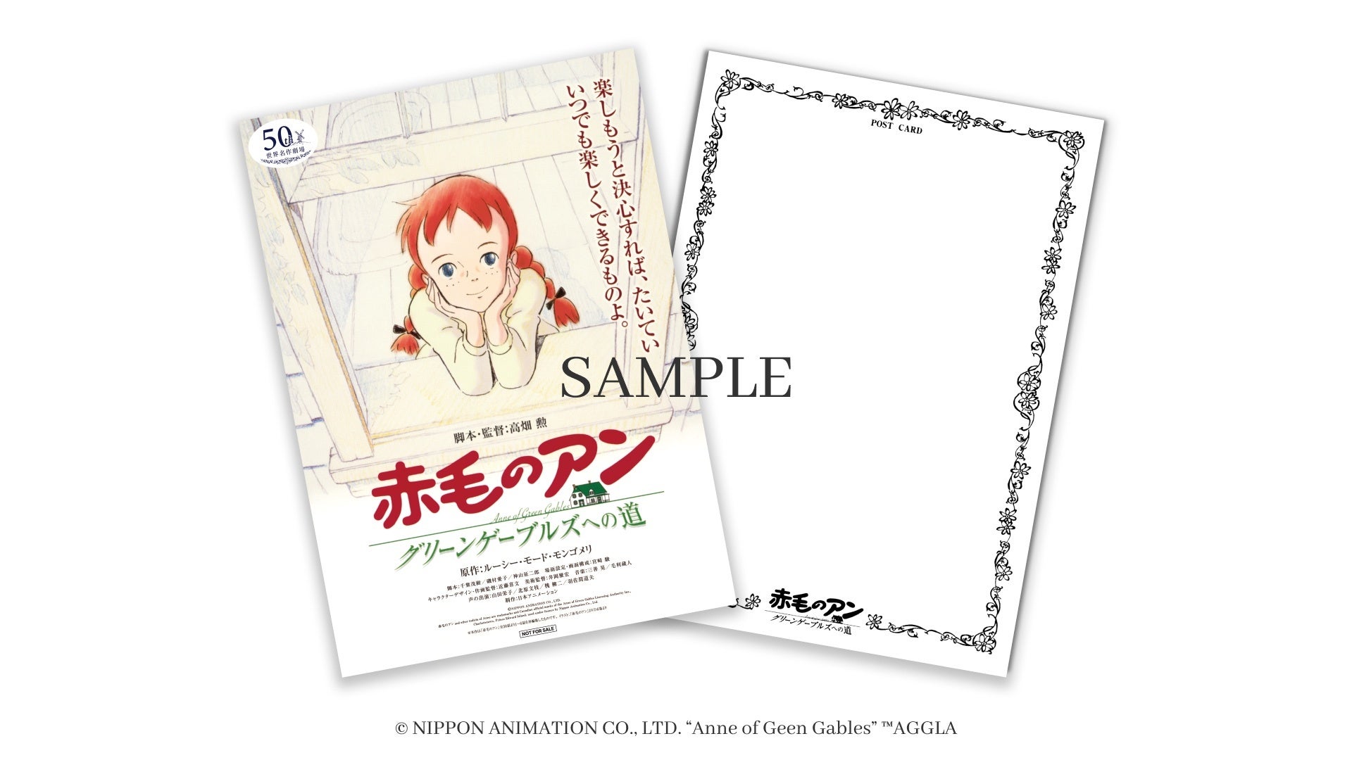 入場者プレゼントとして配布されるのは、ポスタービジュアルにもなっている、窓辺から空を見上げるアンの姿が描かれたポストカード。15年前の上映時に限定にて配布されたアイテムの「世界名作劇場50周年」を記念した復刻版となります。