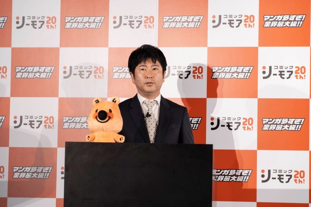 はじめに、取締役 炭田 真也よりコミックシーモアの紹介、今後の展望を説明。また今回の新CMのコンセプトについて「コミックシーモアはリーディングカンパニーとして電子書籍市場の拡大に貢献してまいりました。2024年8月に20周年を迎えるにあたり、より多くの方々にご愛用いただくため、コミックシーモアへのハマり具合の違う3人のマンガ好き仲間を新たに設定し、コミックシーモアの「マンガ多すぎ!」な世界が広がる電脳空間を体験していくCMを制作しました。」と語りました。