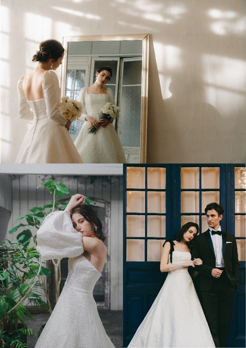 今回の新作ウェディングドレスは、「Resoll Royal Bonny(ボニー)」「Resoll Nature Schoen(シェーン)」「Resoll Royal Chou chou(シュシュ)」の3デザインです。「Bonny」は、高級感とトレンド感のあるジャガード⽣地を取り入れたAラインドレスで、ロングスリーブ、ベロア生地のダークブラウンリボン、パフスリーブの袖にチェンジができる3wayとなっています。「Schoen」は、繊細ながらも華やかな光を放つグリッターレースが美しいマーメイドラインのドレスです。付属のフリルオフショルダーを着用することにより、マーメイドラインのクールな印象とは対照的な、柔らかさを感じさせる印象へと変化します。「Chou chou」は、存在感のあるチュールのロングスリーブを取り⼊れた、ふんわりと優しさを纏うプリンセスラインのドレスです。透明感のある⼤柄レースを使⽤したバックトレーンは、歩くたびにキラキラと輝くビジューが施され、抜け感もありつつ優美な姿を演出してくれます。付属のオフショルダーとロングスリーブで、4wayのスタイルが叶います。