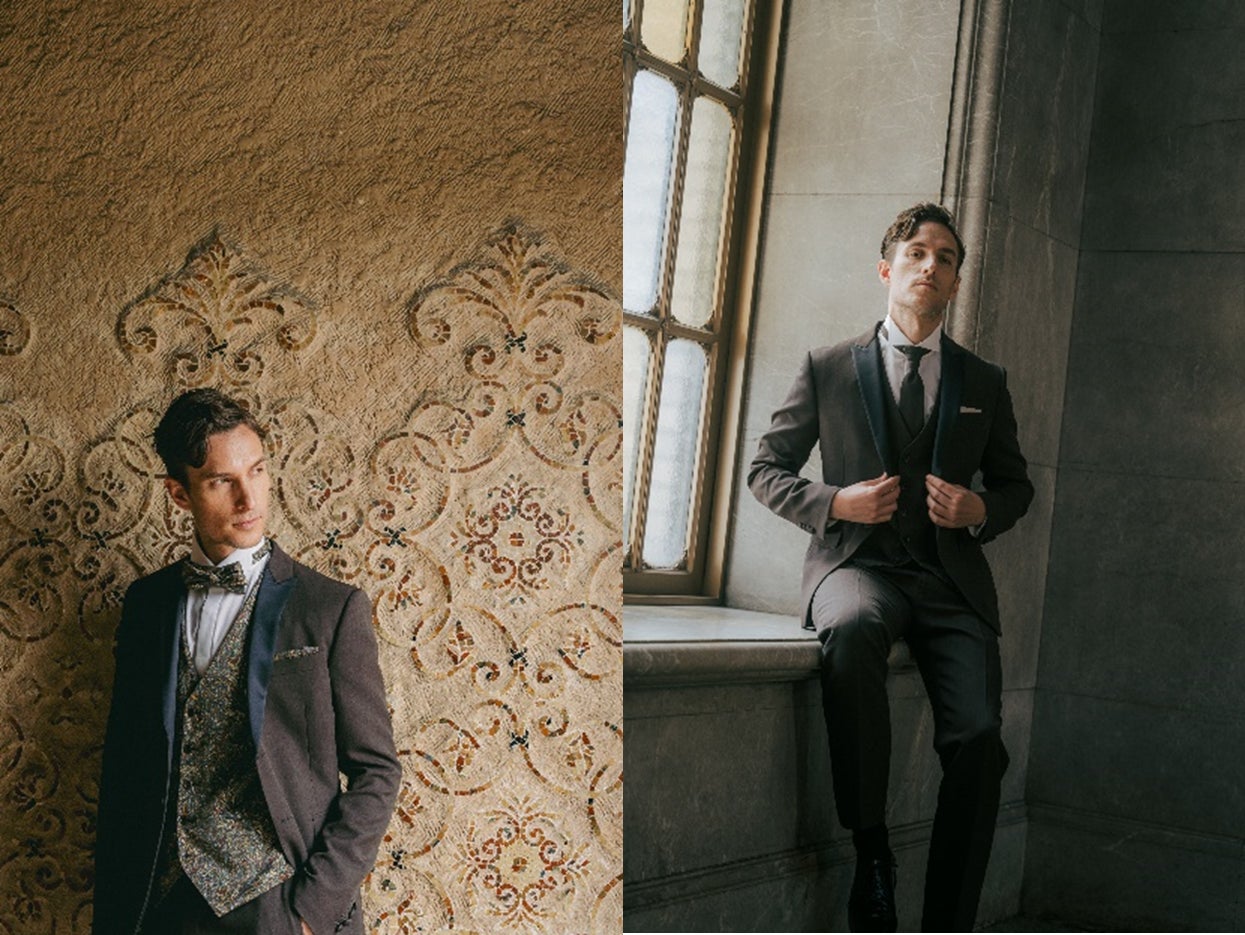 新作タキシードは、1デザインが登場します。「Resoll Noir CAPLICE(カプリス)」は、ブラックに近いダークブラウンのカラーで、光の当たり⽅によって様々な表情に変わります。 ブラウンとリバティ柄のリバーシブルベストは印象をガラリと変え、⼤⼈の余裕のなかにも遊び⼼を感じるデザインです。