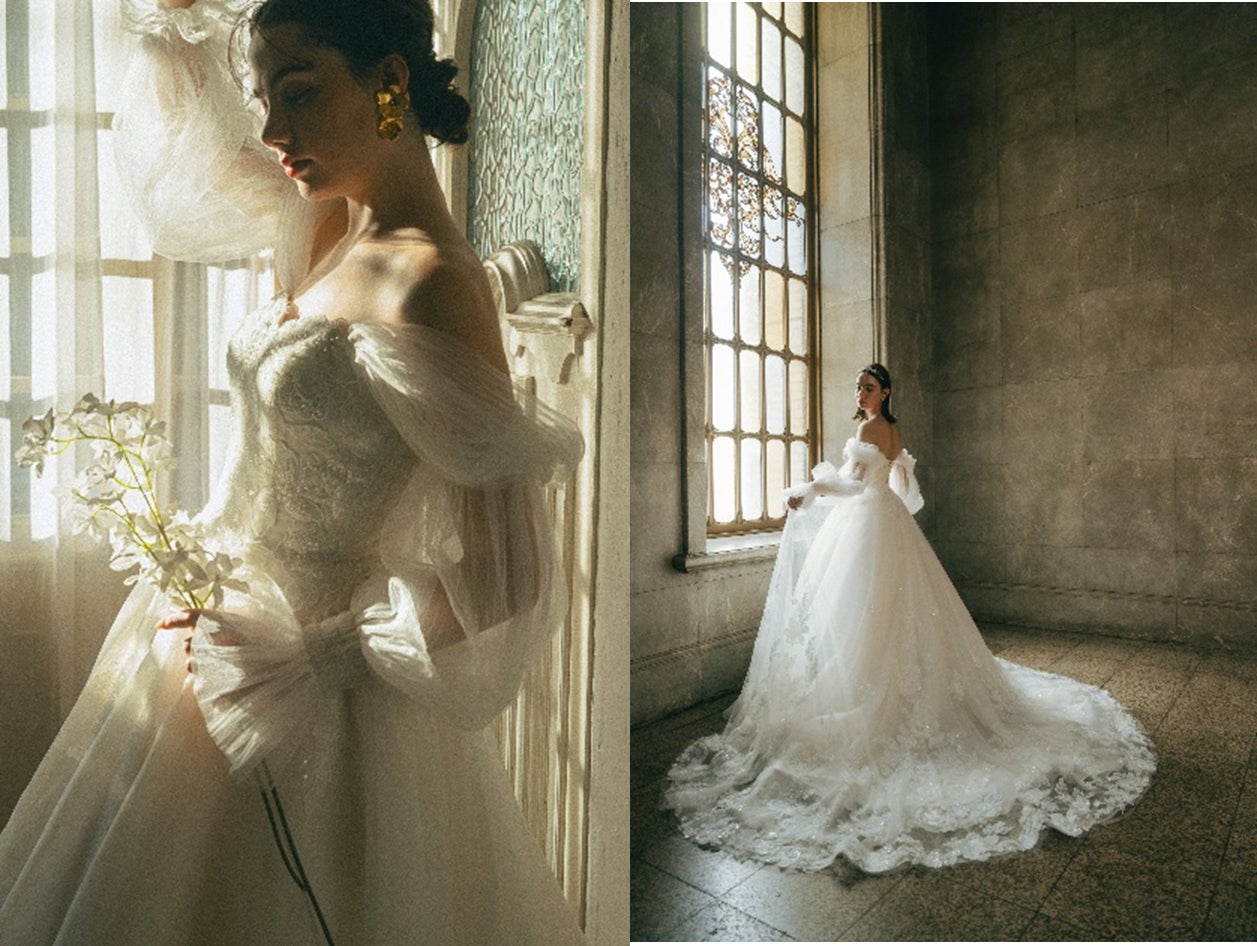 「Chou chou」は、存在感のあるチュールのロングスリーブを取り⼊れた、ふんわりと優しさを纏うプリンセスラインのドレスです。透明感のある⼤柄レースを使⽤したバックトレーンは、歩くたびにキラキラと輝くビジューが施され、抜け感もありつつ優美な⼥性を演出してくれます。 オフショルダーとロングスリーブは4wayのスタイルが叶います。愛らしく柔らかいスタイル、すっきりと綺麗なスタイル等、お気に入りの着こなしが可能です。