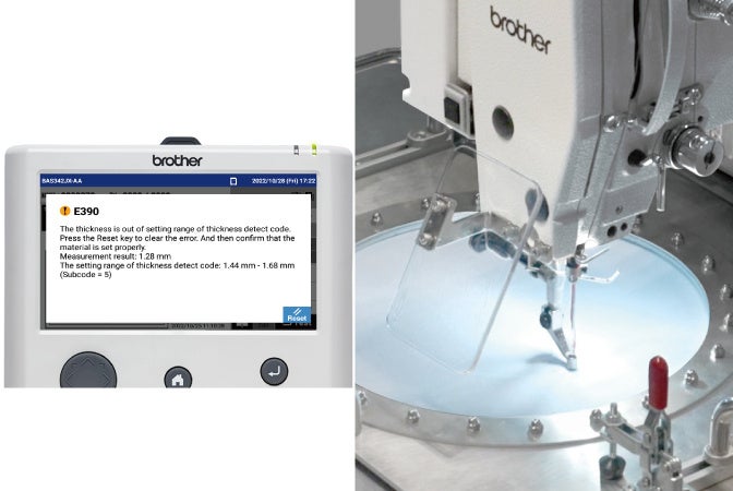縫製生地の厚みを縫製開始前に測定し、設定した厚みと測定値が異なる場合にエラーを表示する機能を標準搭載することで、生地の重ね枚数の間違いを未然に防ぐ。