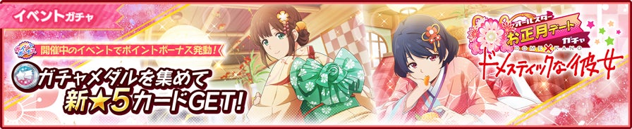 イベントに先駆けて、コラボ作品ごとの「お正月デートガチャ」が期間限定で登場します。コラボ作品の登場ヒロインたちをピックアップした新しいガチャで描き起こし期間限定の★5カードや衣装を、ぜひ獲得してください。