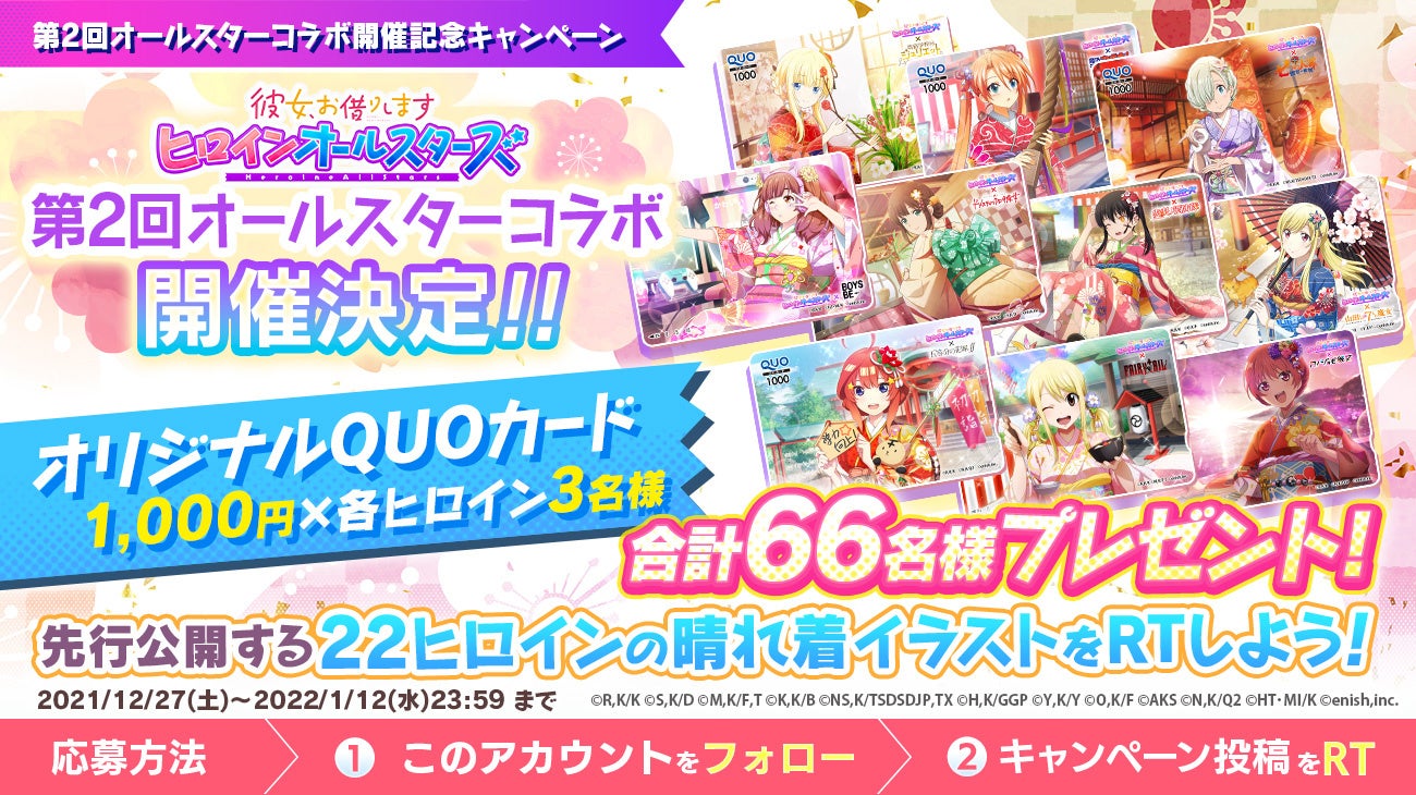 また、コラボイベントに先駆け2022年1月1日(土)より、各コラボヒロインたちの晴れ着姿を描き起こした新イラストのカードが手に入るガチャを開催いたします。さらに、2021年12月27日(月)よりオールスターコラボ開催を記念して、晴れ着姿のヒロイン達の新カードイラストのオリジナルQUOカードが当たるキャンペーンを開始しました。