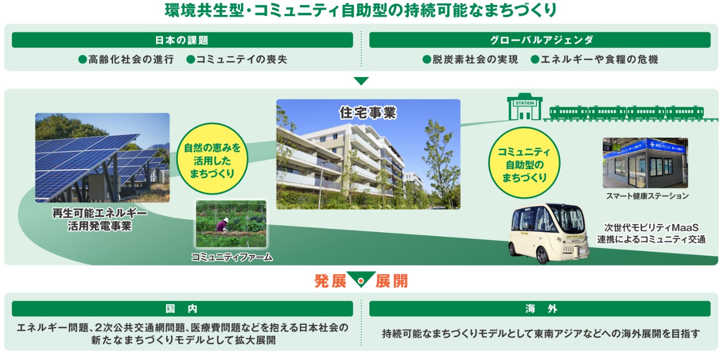 また、両社グループの持つ高いノウハウを踏まえて環境共生・コミュニティ自助型の持続可能なまちづくりを目指していきます。さらに地方を中心とした住宅事業や再生可能エネルギー事業を通じて、まちづくりや駅前開発を含めた地方創生を両社で連携して実現していきます。