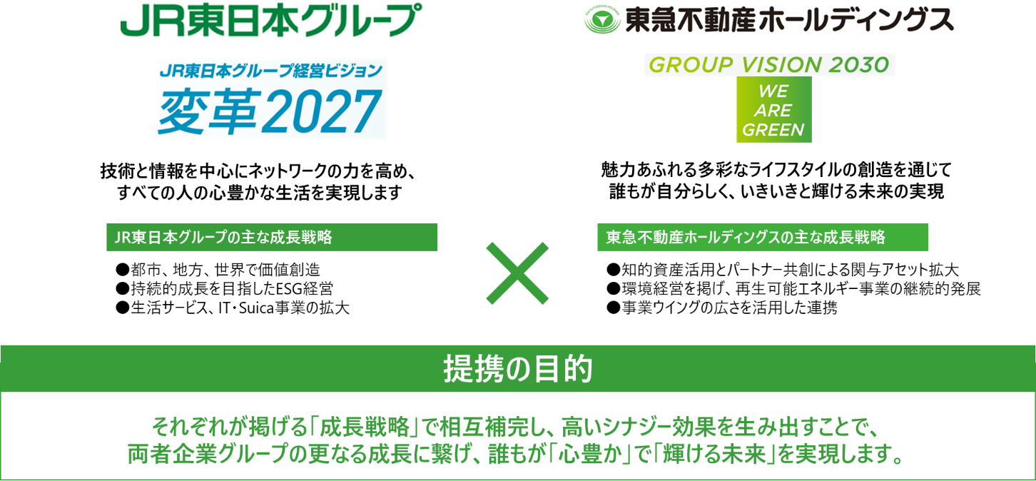 JR東日本グループが掲げるすべての人の心豊かな生活を目指す「変革2027」、東急不動産ホールディングスの「環境経営」と「DX」を全社方針に掲げた長期ビジョン「GROUP VISION 2030」を、両社が連携することで加速していきます。さらにその先の社会課題解決と両社グループの収益力強化を通じた企業成長を目的に、住宅事業、再生可能エネルギー事業を軸とした事業を推進します。