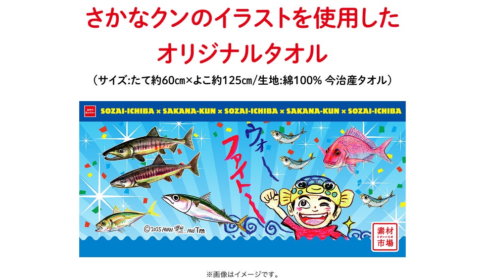 『素材市場』アンバサダーの「さかなクン」が描いたイラスト入りのオリジナルタオルが