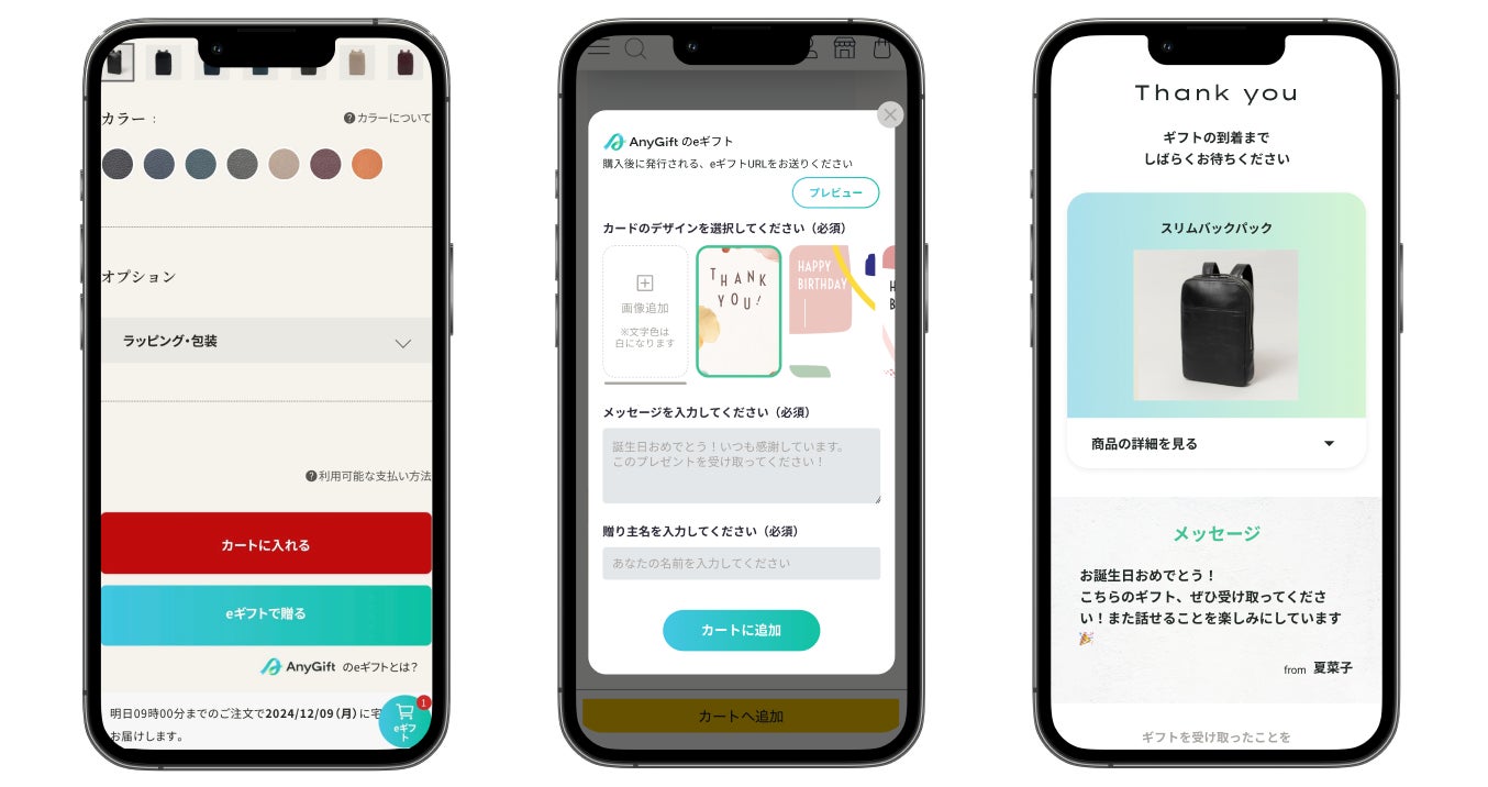 しかしながら、オンラインショップ上でギフトを贈る際にお相手の方の送り先を確認する必要があるなど使いづらさがありました。ビジネスレザーファクトリーが展開するさまざまなアイテムを通して、より多くの「はたらく」を応援すべくeギフトサービス『AnyGift』導入に至りました。