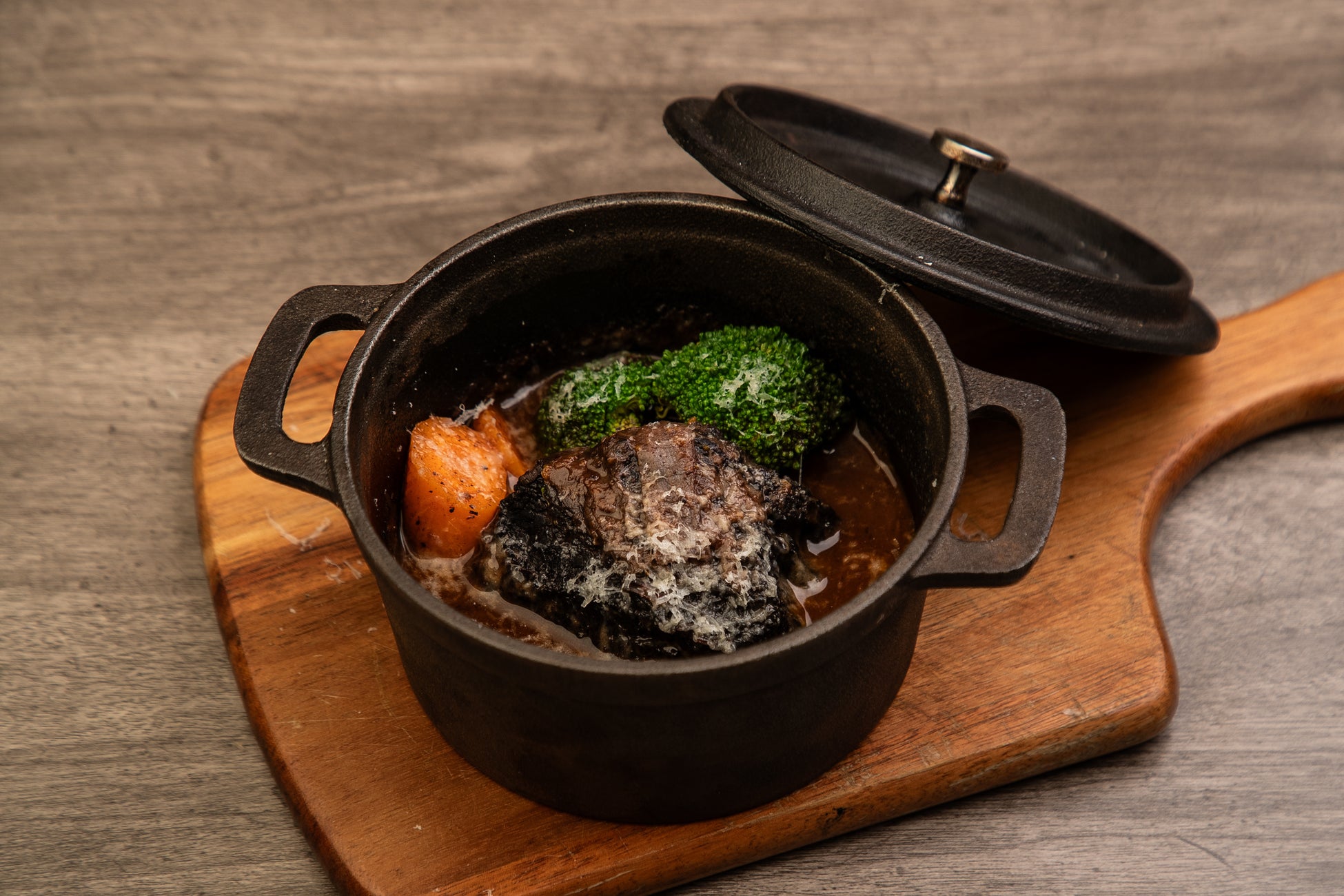 柔らかく煮込んだ牛ホホ肉を赤ワインのコクと香りで仕上げた一品。仕上げにチーズを削ってお召し上がりください。