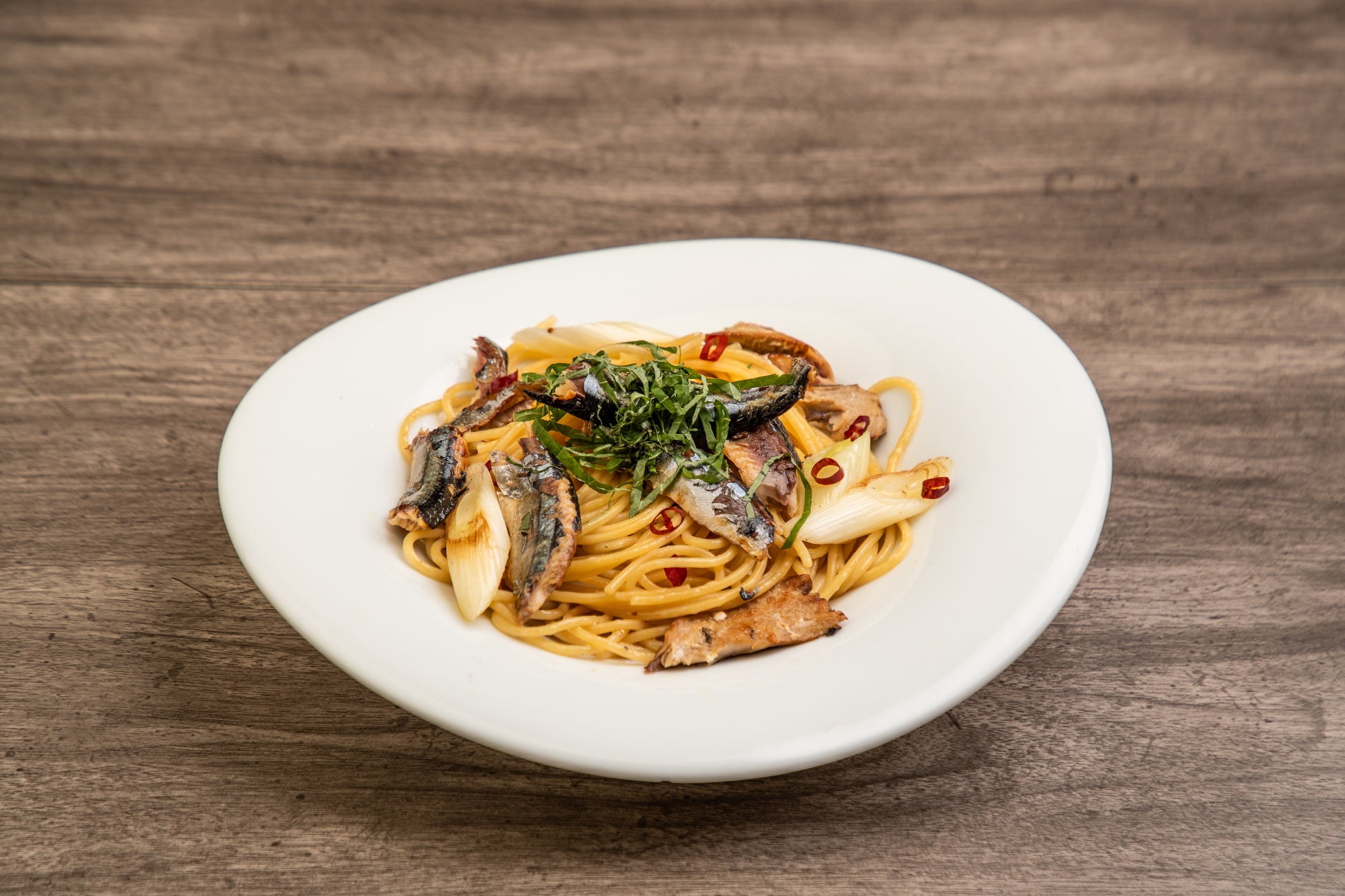 香ばしい秋刀魚と甘みのある長ネギをオイルソースで仕上げたシンプルなペペロンチーノ