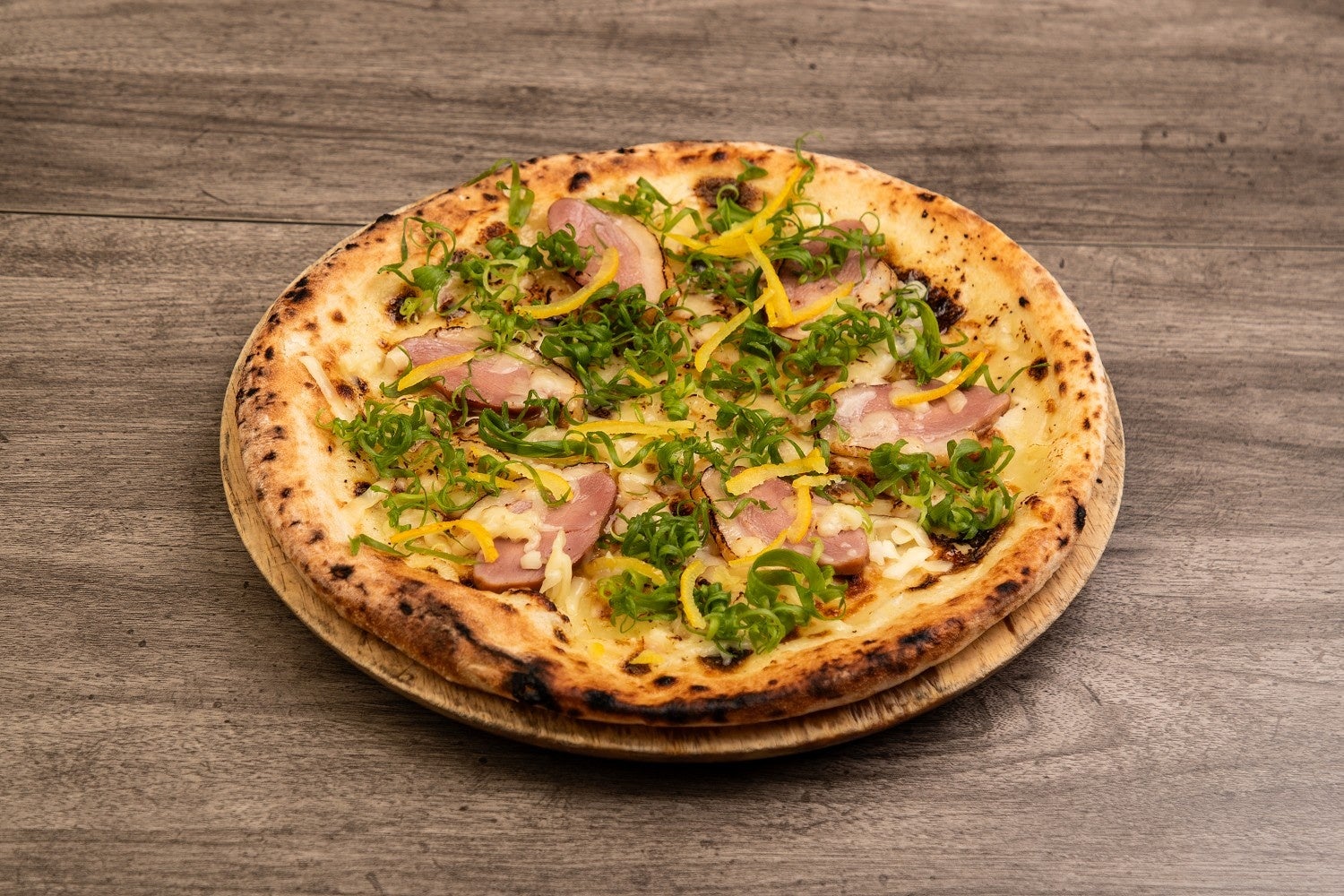 香ばしく焼き上げた合鴨と、甘みのある九条ネギを濃厚なクリームソースで。柚子の香りがふわっと香る和テイストの本格ピッツァ