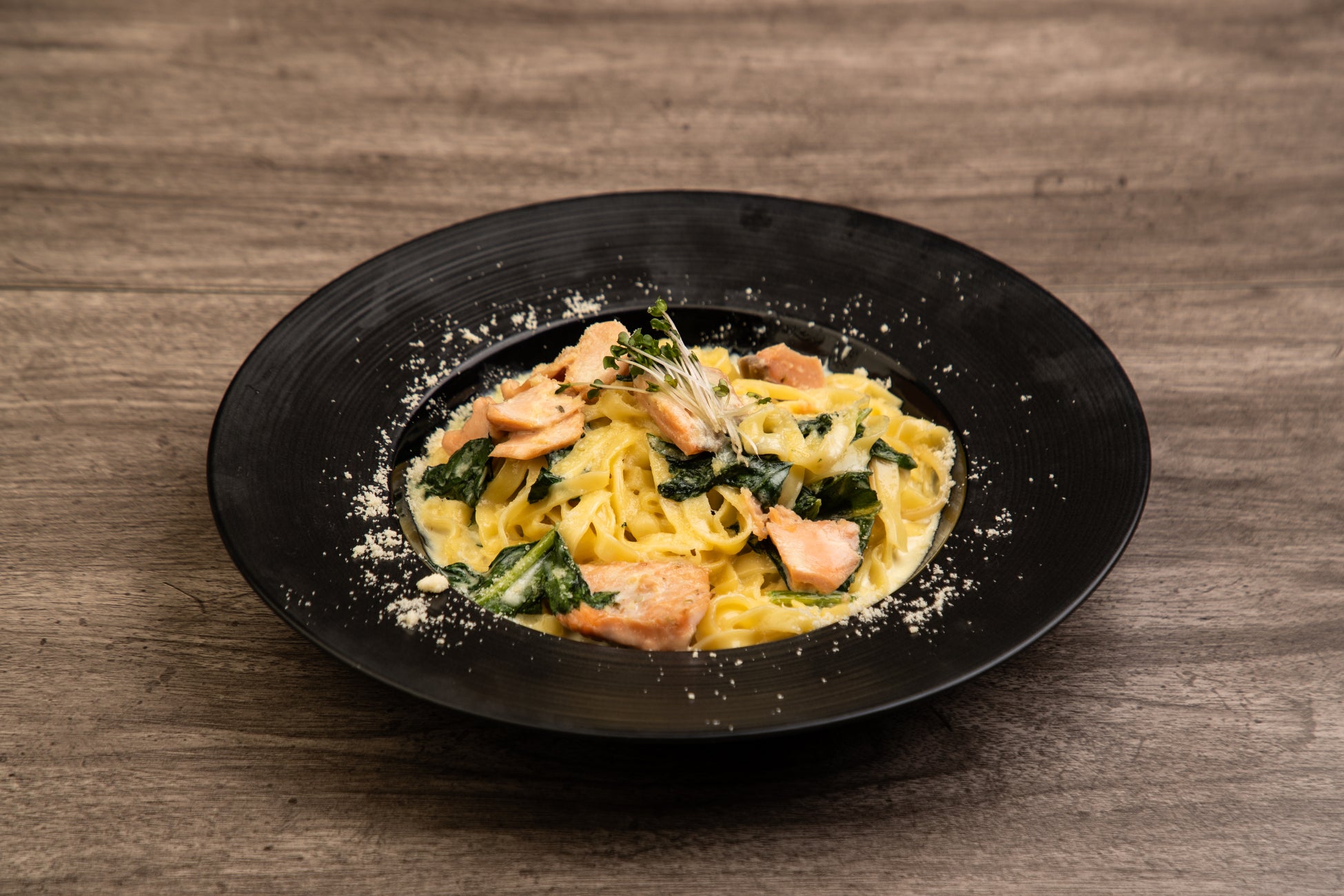 鮭とほうれん草を濃厚なクリームで仕上げたパスタ。平打ちタリアテッレにソースがしっかりと絡む、優しい味わい