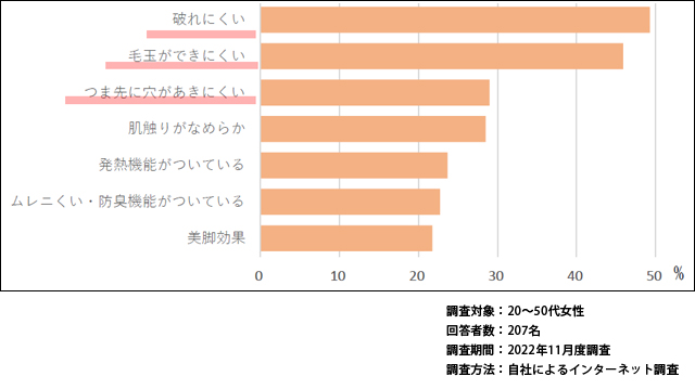 グンゼが20~50代の女性207名を対象に実施したアンケート調査では、秋冬に選ぶタイツの機能として「破れにくさ」「毛玉ができにくい」「つま先に穴があきにくい」といった丈夫さに関する項目が上位を占める結果となりました。
