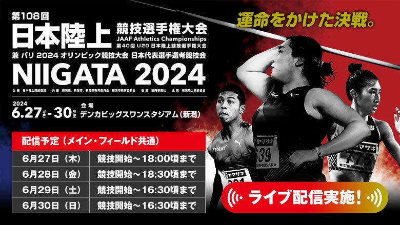 2024年6月27日(木)~30日(日)の4日間、デンカビッグスワンスタジアム(新潟)で開催する「第108回日本陸上競技選手権大会/第40回U20日本陸上競技選手権大会」をライブ配信いたします!
