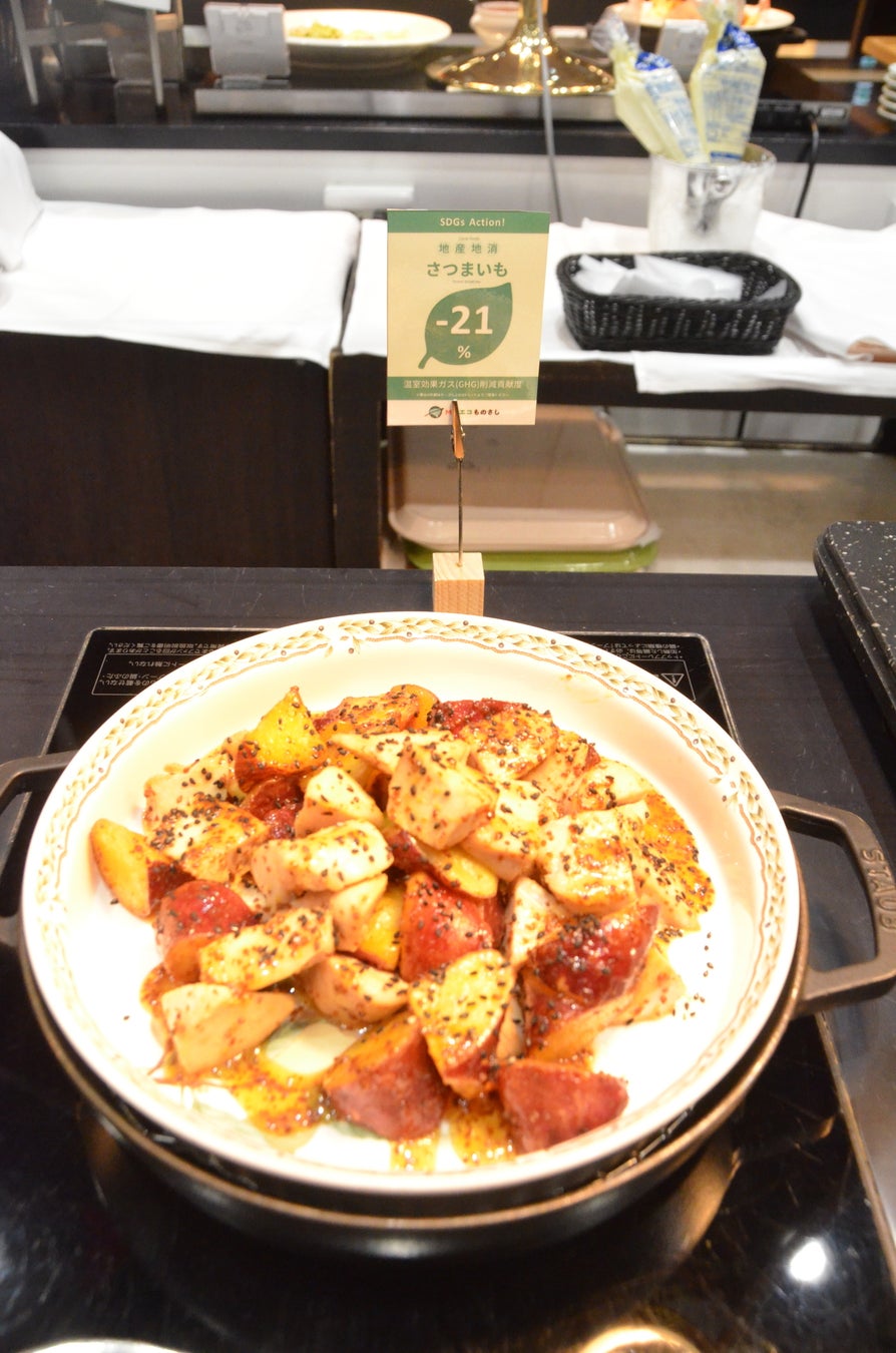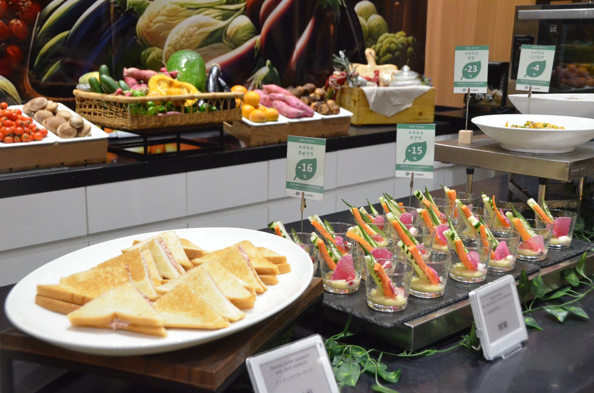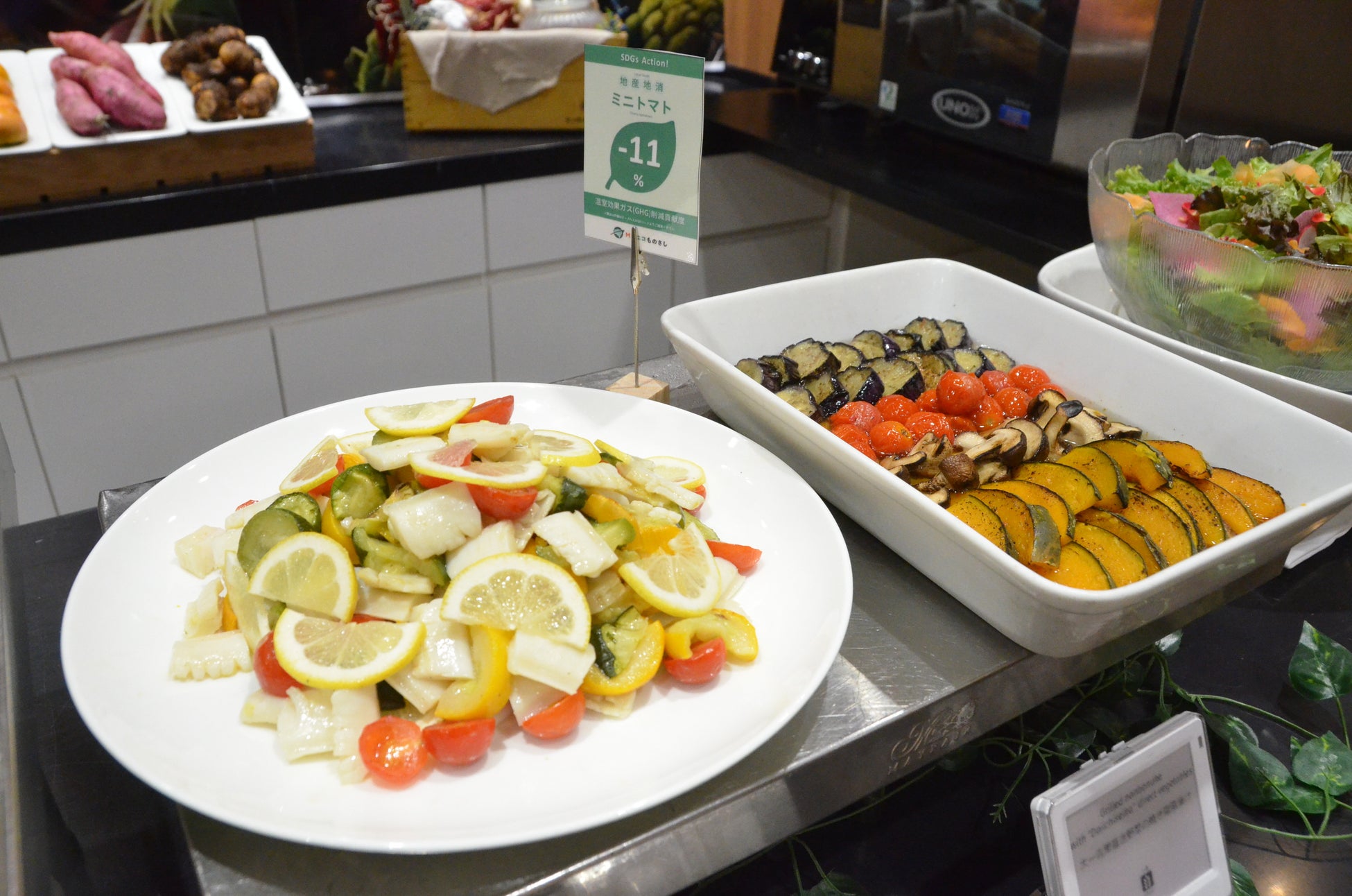 秋のブッフェでは、豊橋、東三河から調達された食材について、例えば「柿 -23%」と表示されます。従来の他地域から調達するのと比べ輸送距離が短縮されるので、温室効果ガスの削減につながり、その貢献量を数値で表しています。