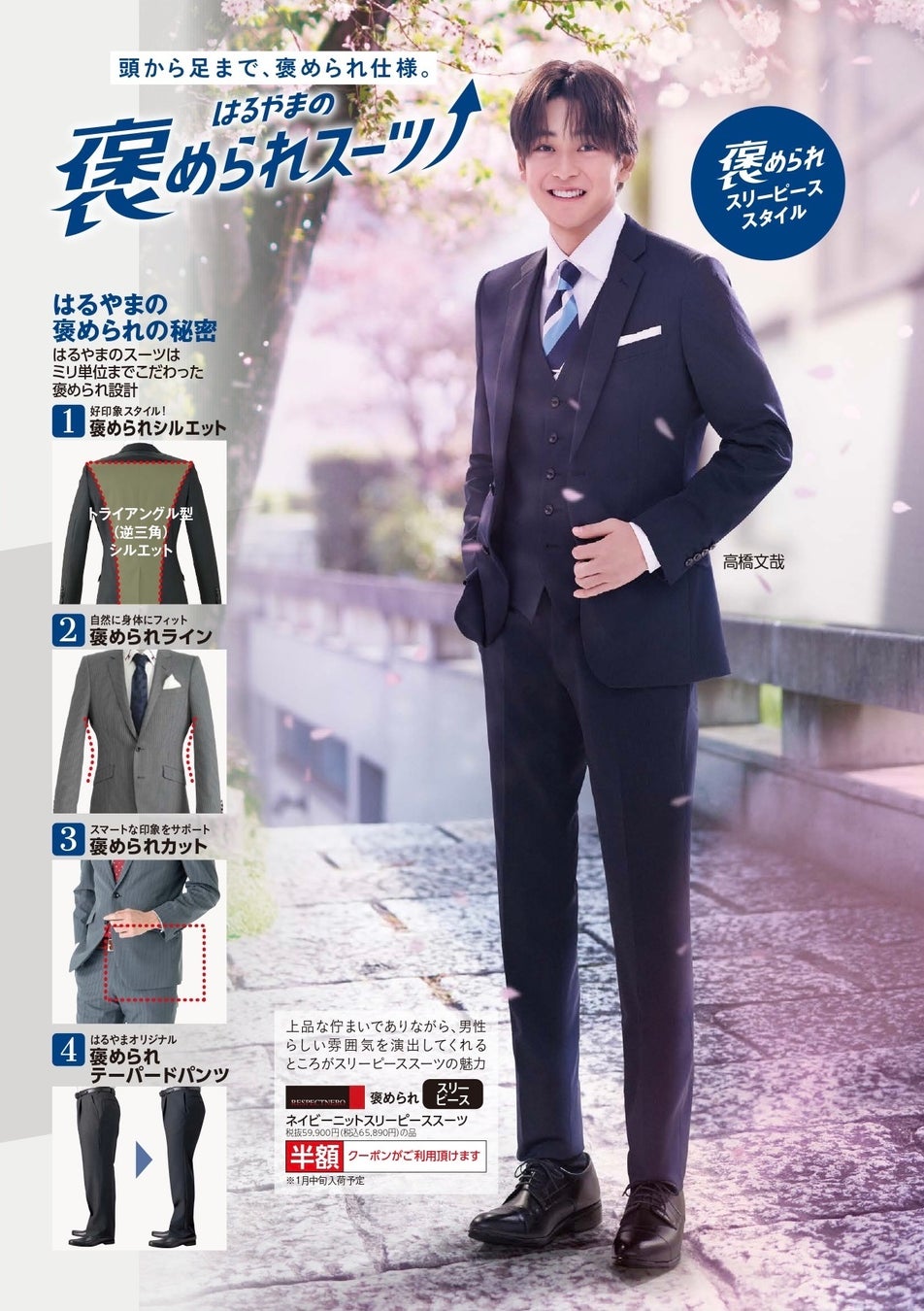はるやまフレッシャーズキャンペーンのメンズイメージキャラクターを務めさせていただいております、高橋文哉です。スーツを着てる大人ってかっこいいな、と思っていたので、こうしてはるやまの「褒められスーツ」を着ることができて嬉しいです。社会人としての一歩を踏み出す皆さんを、陰ながらですが応援しています!