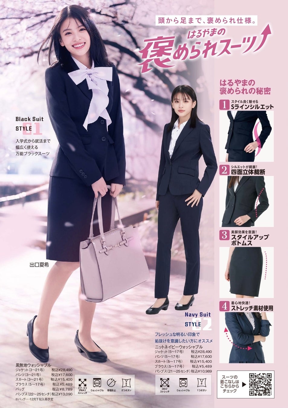 こんにちは、出口夏希です!はるやまフレッシャーズキャンペーンのレディスイメージキャラクターを務めさせていただくことになりました。あまり普段スーツを着ることがないのですが、はるやまの「褒められスーツ」を着ると、気持ちがいいですね!フレッシャーズの皆さん、これから楽しいことや辛いことがあると思いますが乗り越えていきましょう!私もお仕事頑張ります!