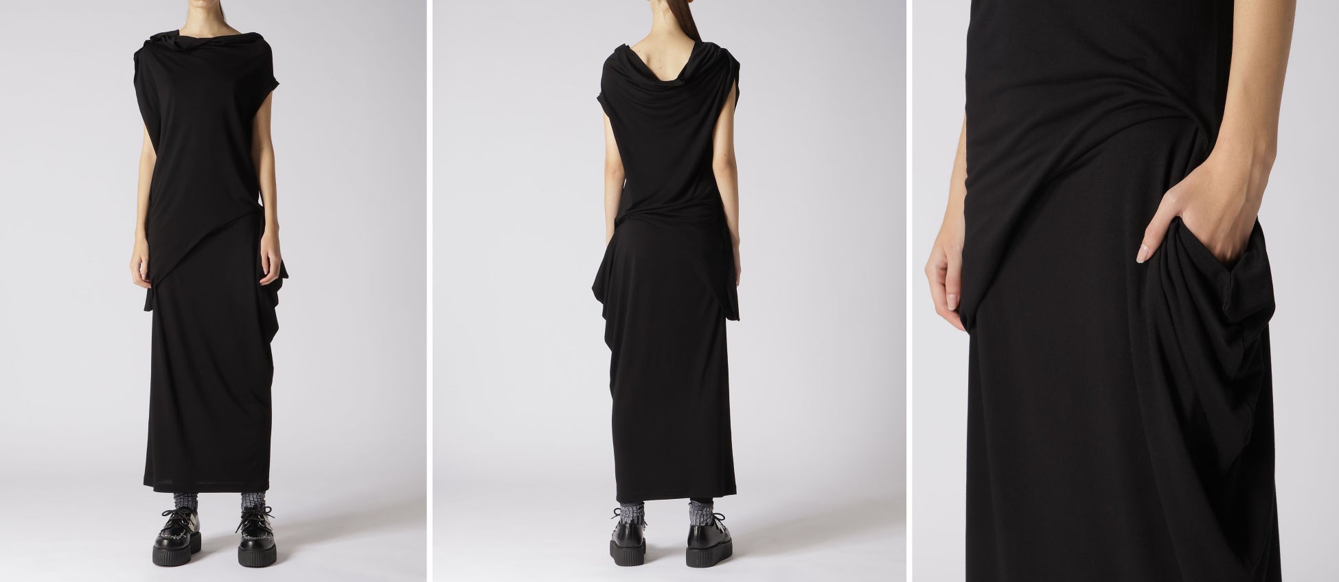 ショルダーラップのネックライン、左ドレープにポケット、柔らかくなめらかなドレープ、