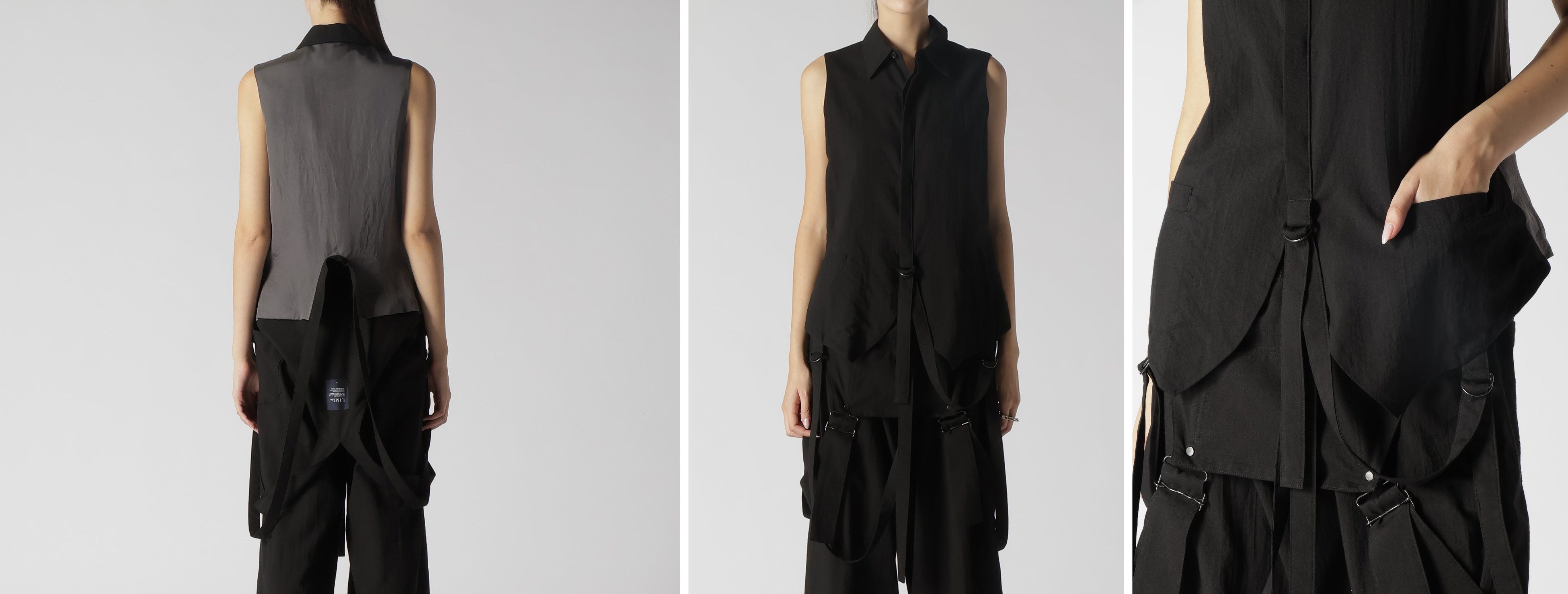 両脇にシームレスポケット、胸当て部分のベルトループを使用して2WAYの着こなしが可能、