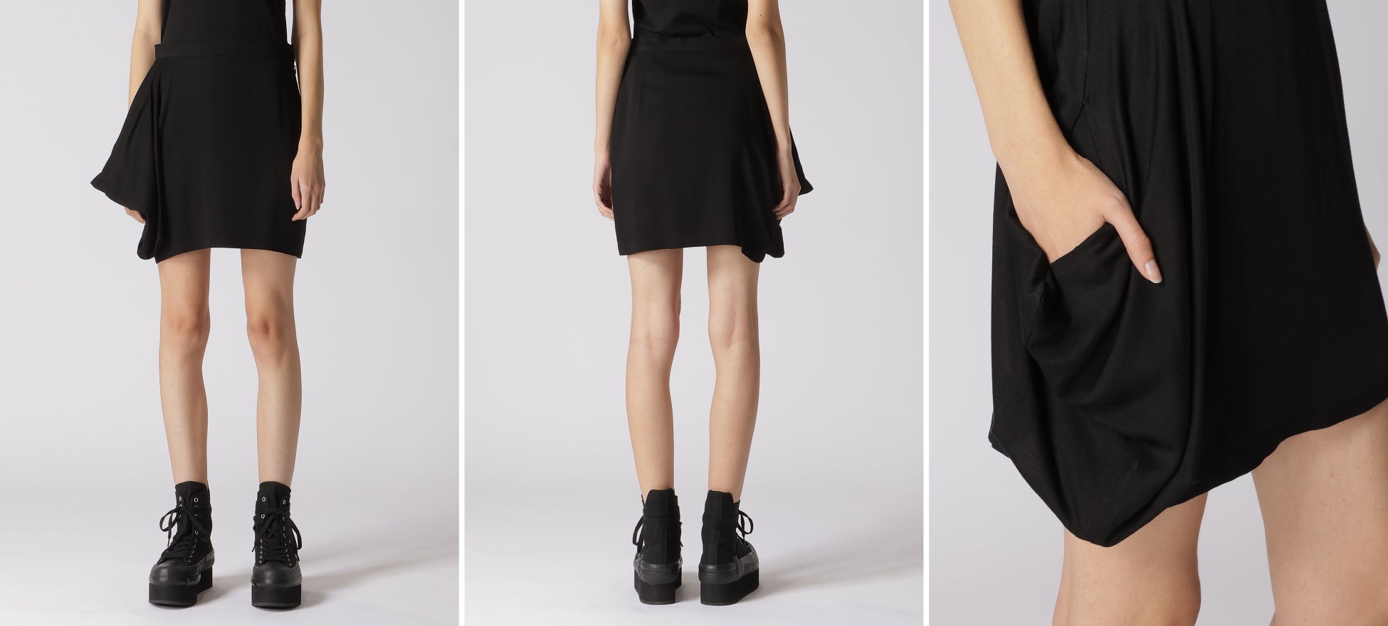 ミニスカート内蔵、左裾に結びディティール、アシンメトリーなヘムライン、セミハイウエスト
