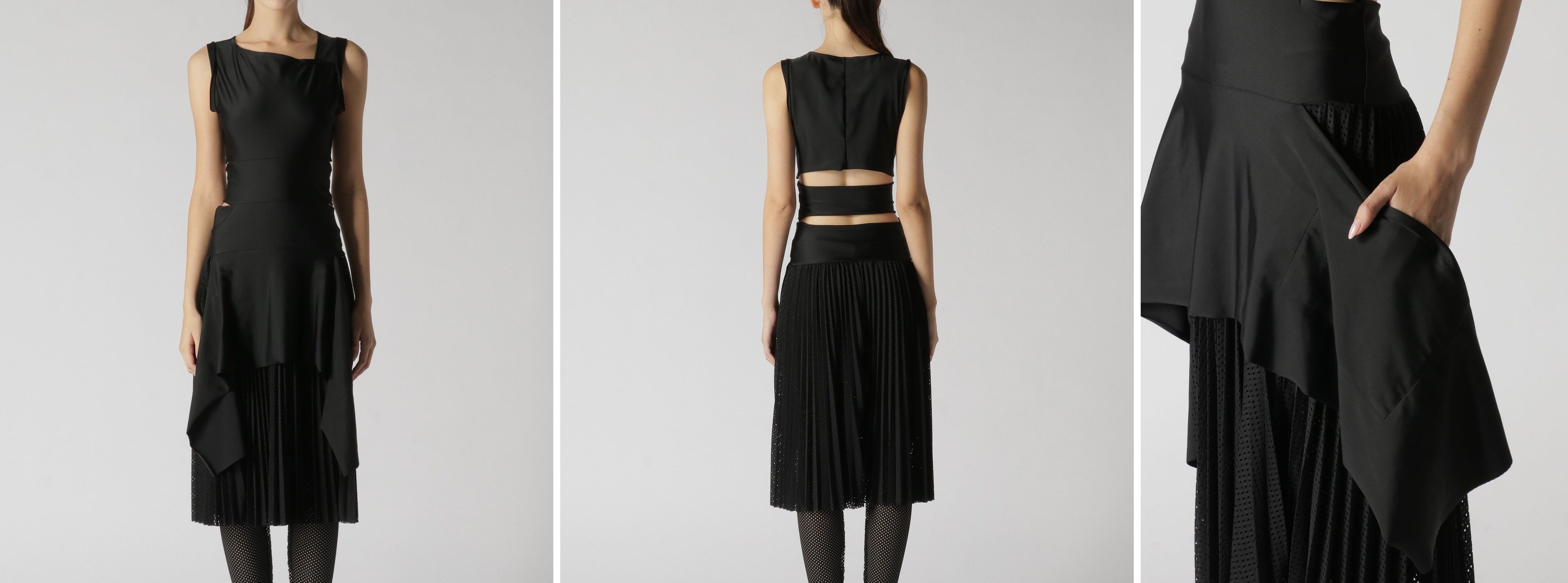 アシンメトリーなショルダーライン、メッシュのアコーディオンプリーツと前身頃のみにあしらわれた