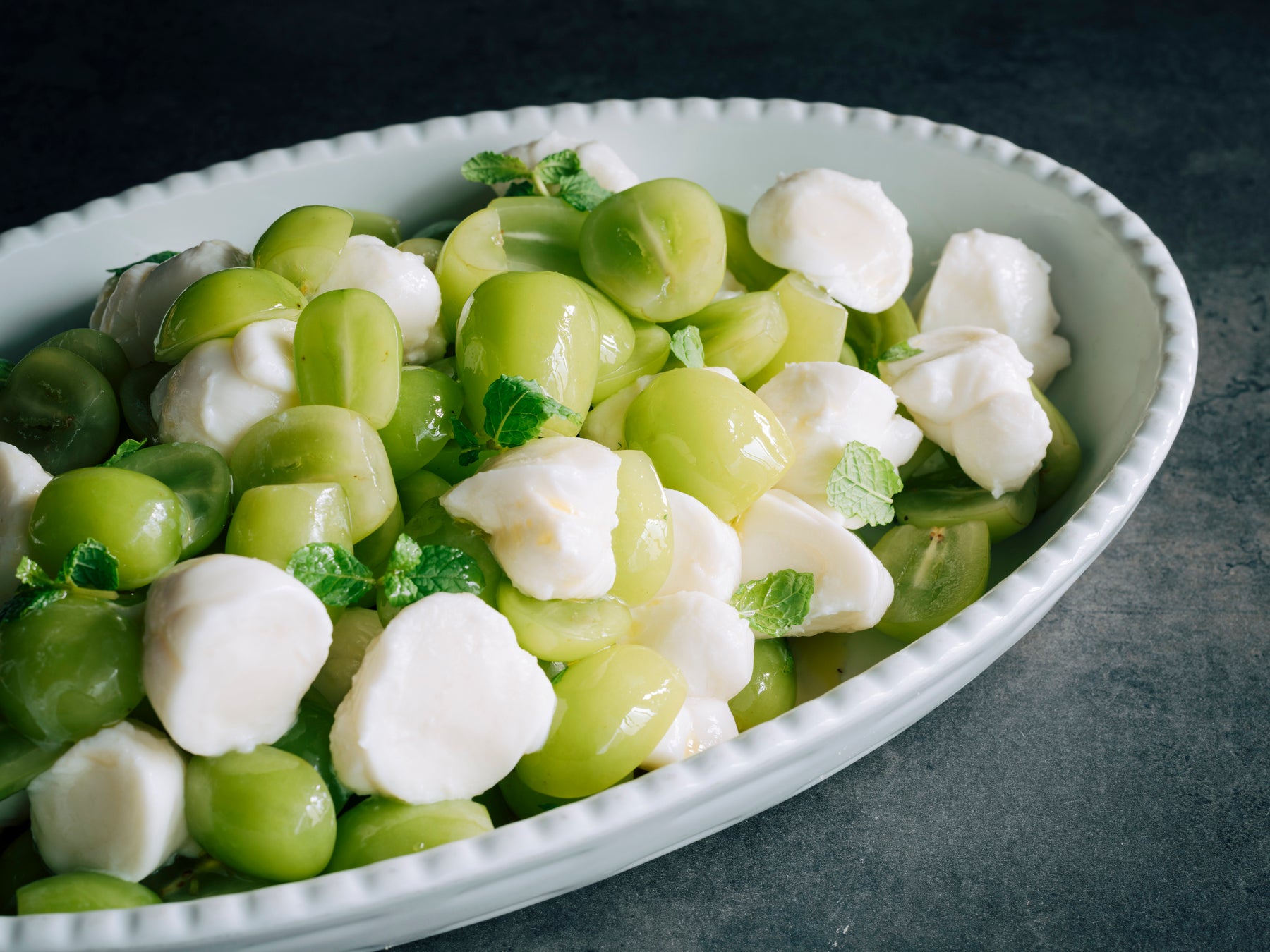もっちりミルキーなモッツァレラと、爽やかで豊かな甘みのシャインマスカットを、ホワイトバルサミコとはちみつの甘酸っぱさがまとめるサラダ。シンプルなカプレーゼ仕立てで、フレッシュミントがアクセントに。