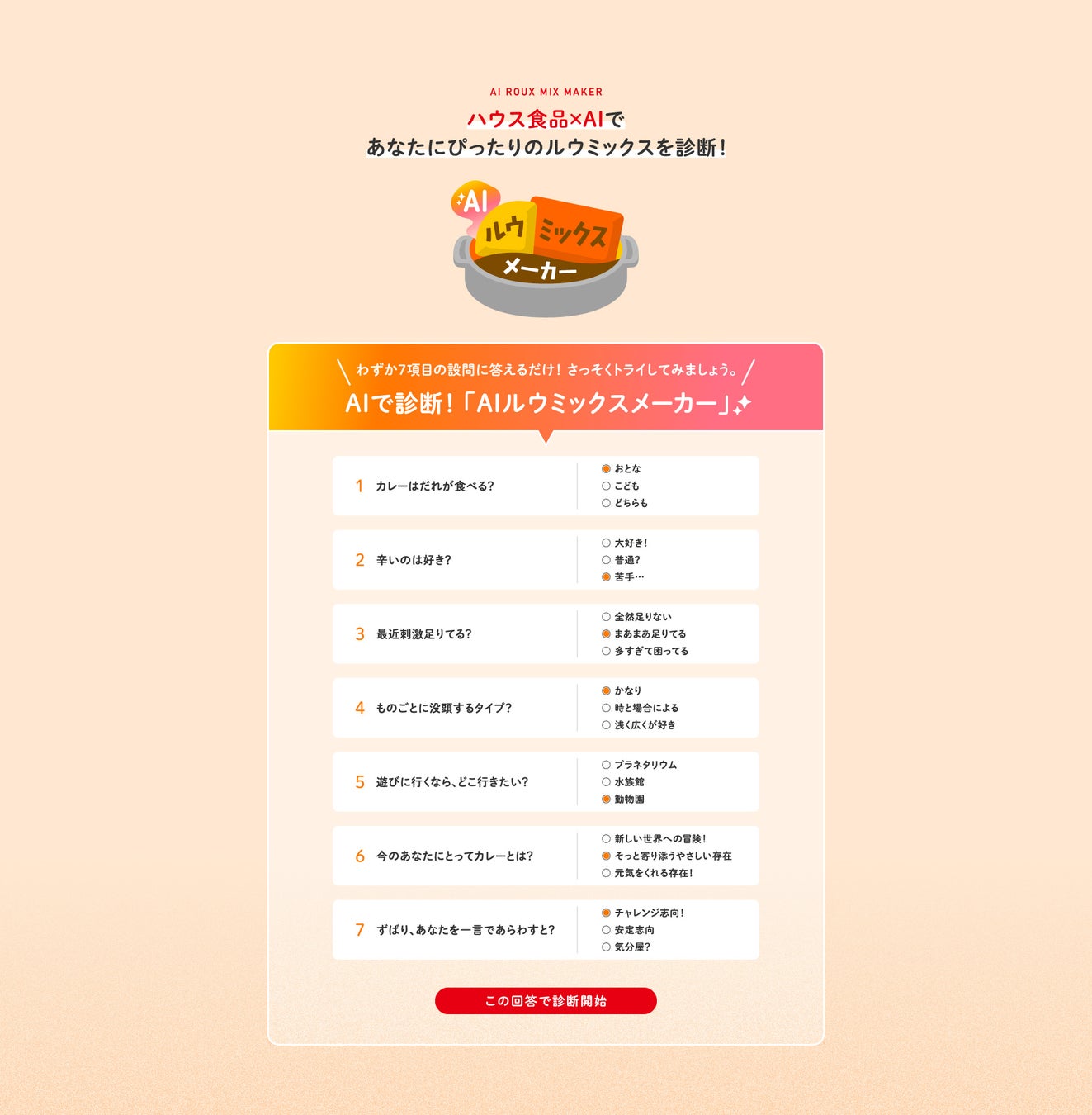 「AIルウミックスメーカー」はAI技術を用い、「カレーはだれが食べる?」「辛いのは好き?」「最近刺激足りてる?」といった、わずか7項目の質問に答えていただくだけで、234通りの組み合わせからお客様にぴったりなカレールウの組み合わせ「ルウミックス」が診断できます。