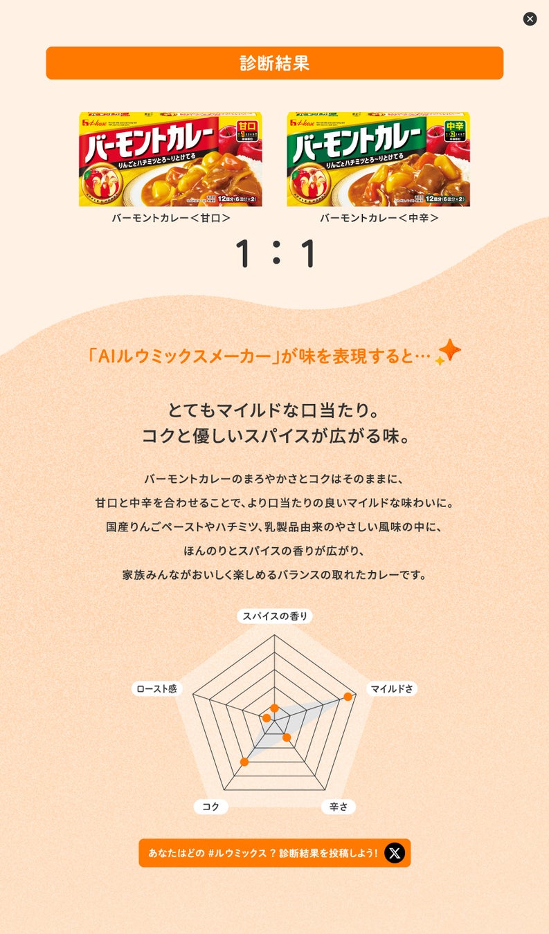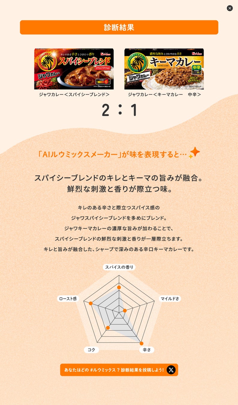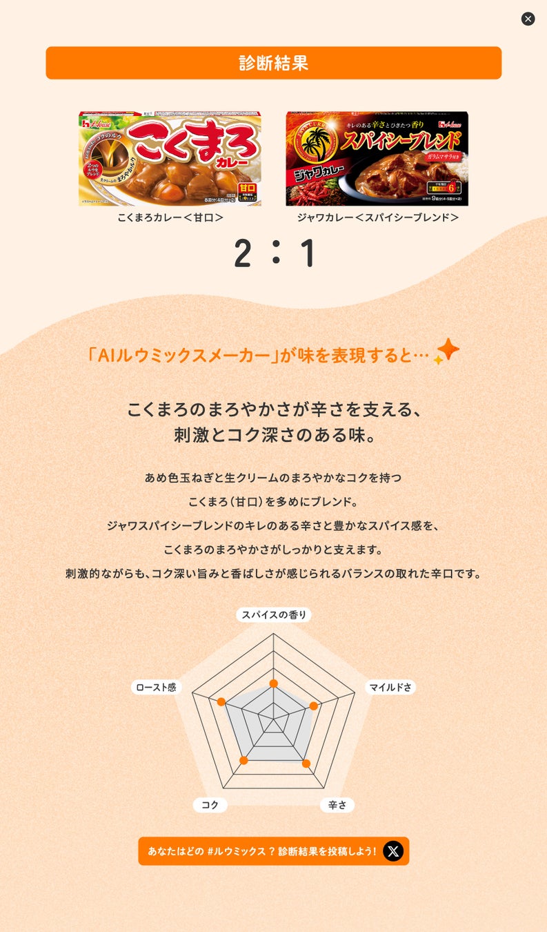 13品目の中から組み合わせ、および3パターンのルウの混ぜ合わせの割合(1:1、1:2、2:1)を用意し、トータル234通りの組み合わせを生成しています。毎日の気分や味の好みに合わせて、「AIルウミックスメーカー」を使い、カレーの混ぜ合わせを楽しんでみてはいかがでしょうか。以下の、特設サイトで診断できますので、ぜひお試しください。