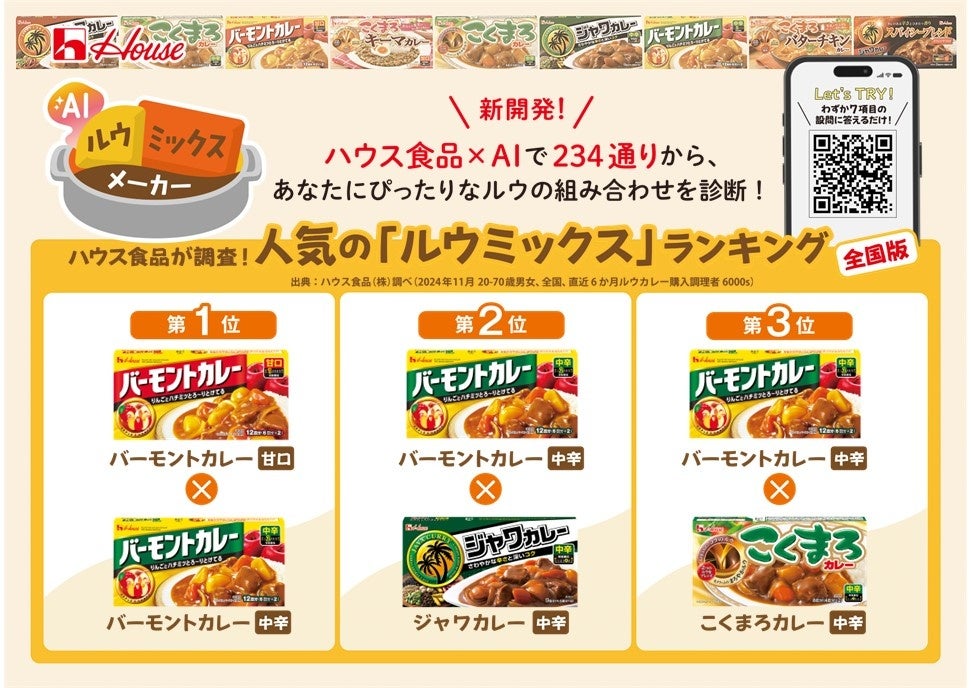 ハウス食品株式会社は、AI技術によって全234通りのルウの組み合わせの中から、その時の気分や好みに合ったルウの組み合わせを診断できる「AIルウミックスメーカー」を開発し、2025年6月30日(月)より特設サイトにて公開いたします。異なるブランドや辛さのルウを混ぜることで、自分の好みの味を見つけたり、新しい発見が生まれたりするなど、カレーの新しい楽しみ方をご提案します。