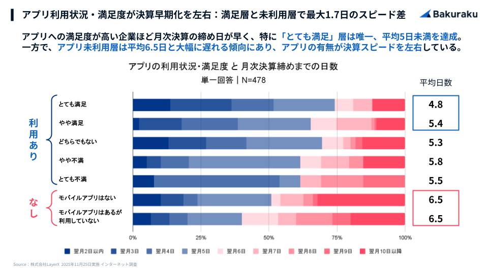 また、同調査では、モバイルアプリの利用状況・満足度が月次決算のスピードに影響するという結果もでています。アプリへの満足度が高いほど決算締め日が早く、「とても満足」層は平均4.8日。対してアプリ未利用層は平均6.5日と遅れる傾向にあり、アプリの有無が決算スピードに影響していることが明らかになりました。