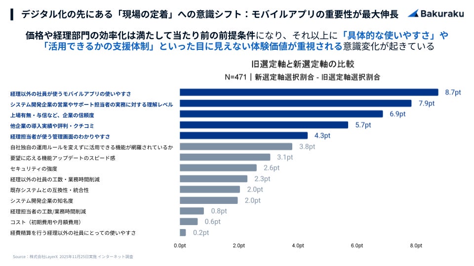 LayerXが実施した「経費精算システムの選定基準の変遷と月次決算早期化への影響に関する実態調査」(※1)によると、システム導入時に重視していた項目と、その後システムの入れ替え検討の際の重視項目を比較すると、「モバイルアプリの使いやすさ」が最も大きな伸び(+8.7ポイント)を示しました。