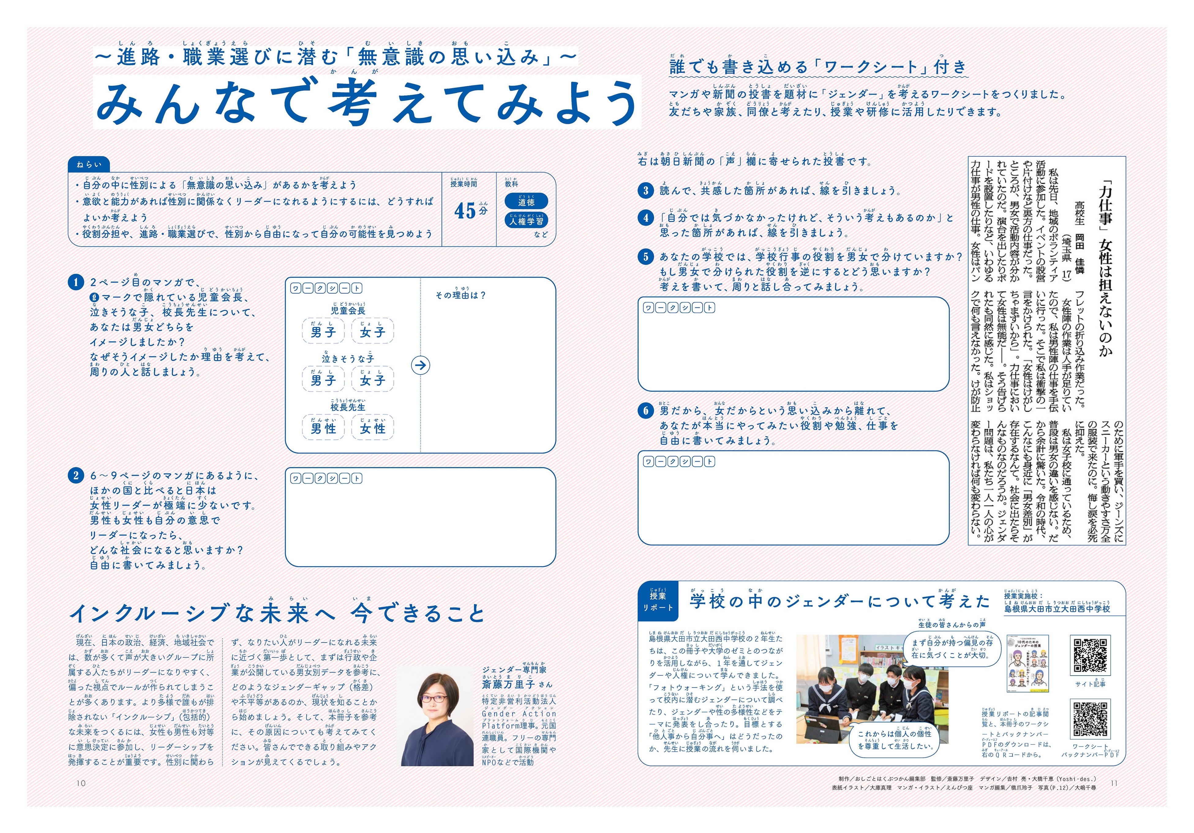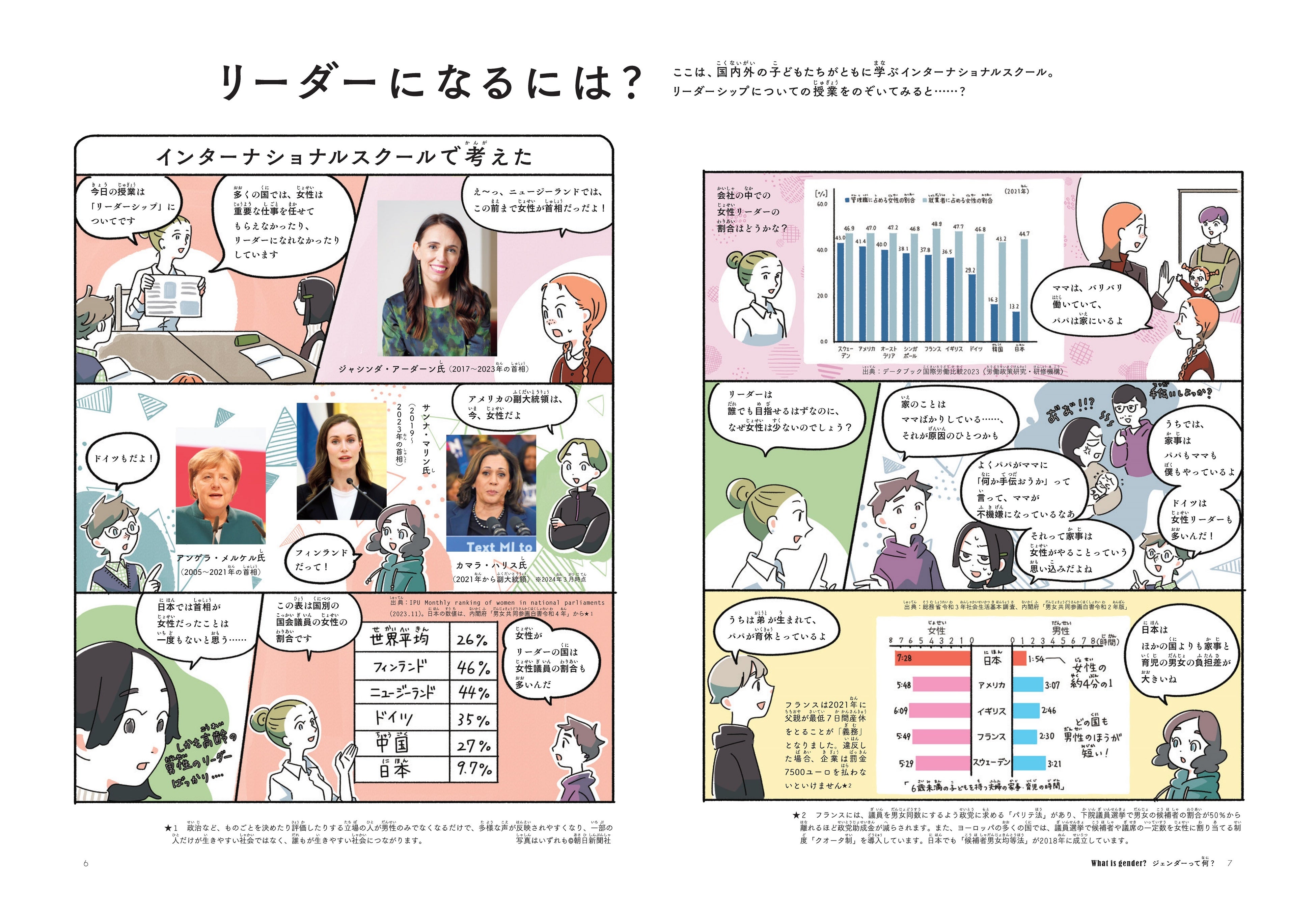 第3弾となる今年の冊子のテーマは、「リーダーシップ」。初めての試みとして、日本と世界のジェンダーギャップや、多様な社会の実現、性別に関係なくリーダーになれる環境のために必要なことをマンガ形式で紹介し、より視覚的にもわかりやすい構成にしました。このほか、社会全体での性別によるリーダーの割合の差や、朝日小学生新聞・朝日中高生新聞読者の小・中学生に聞いたリーダーのイメージやエピソード、進路・職業選びに潜む「無意識の思い込み」を考えるワークシートなどを掲載しています。
