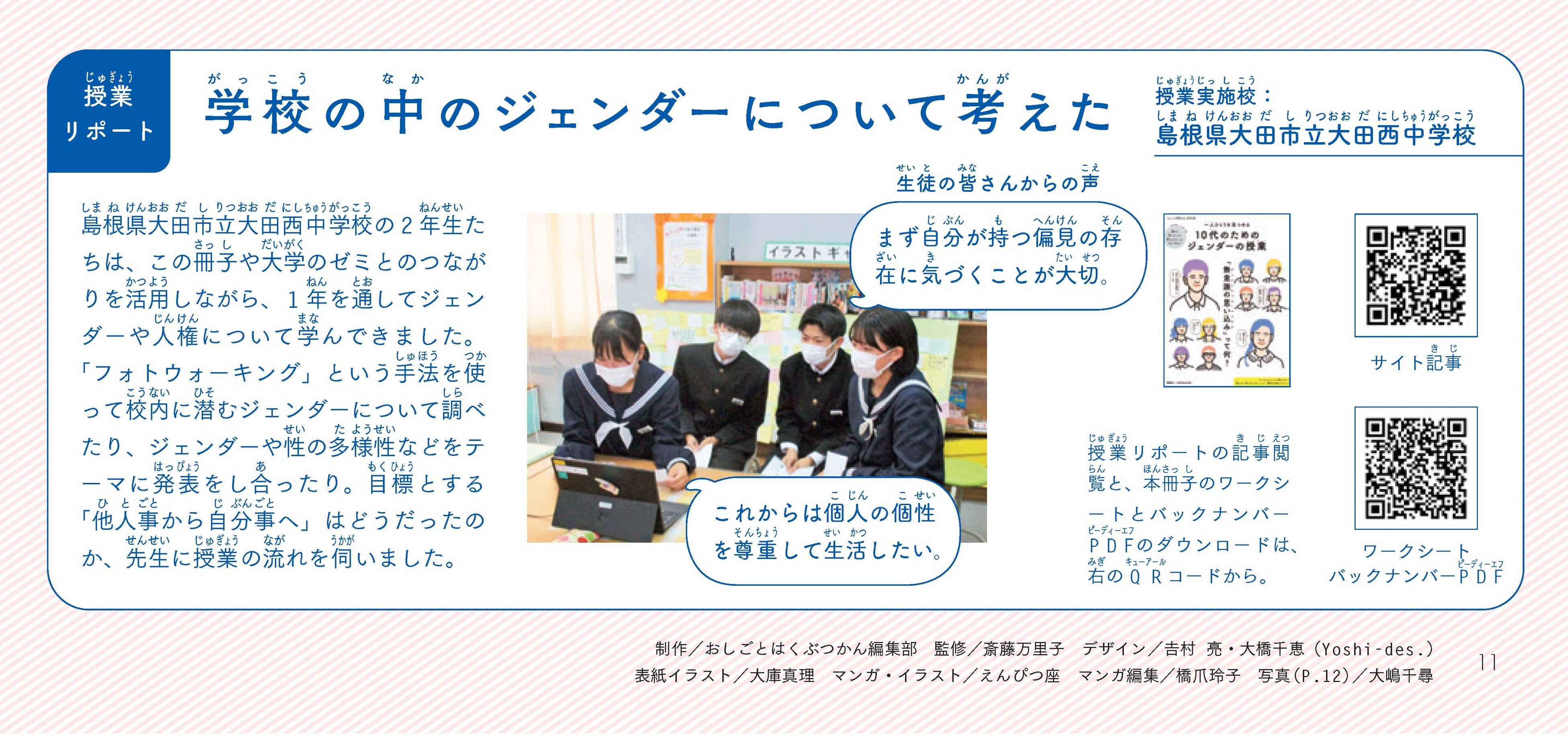 今回の第3弾冊子では、島根県大田市立大田西中学校が冊子を活用しながら、「他人事から自分事へ」を目標に1年を通してジェンダーや人権について学んできた授業リポートについて、紹介しました。