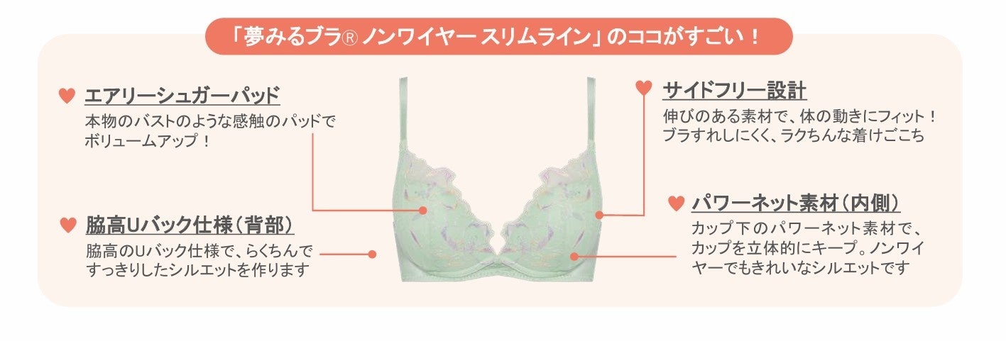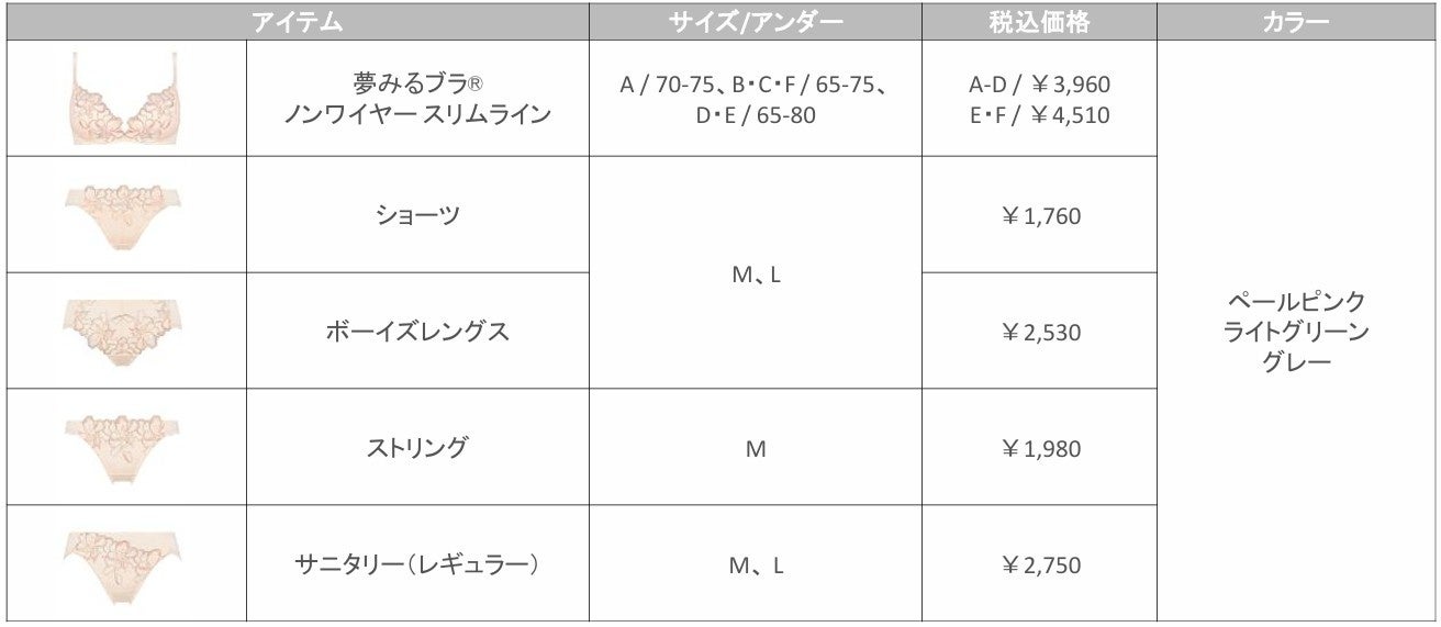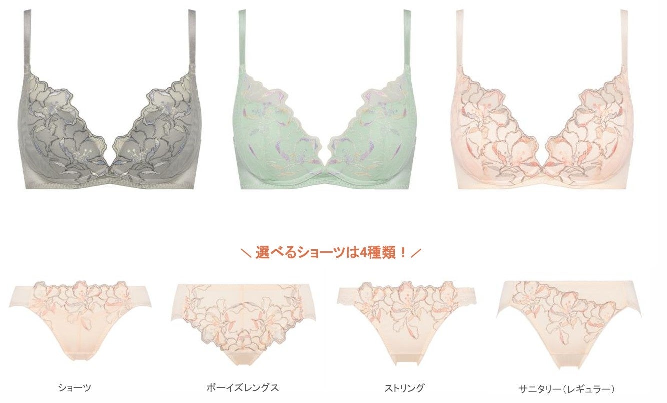 ブラジャーは、ノンワイヤーでありながら、立体感のあるバストラインとすっきりとしたシルエットを叶える「夢みるブラⓇノンワイヤー スリムライン」。ショーツは、お好みに合わせて選べる4種類をラインアップしています。優美なレースに包まれて、虹のヴェールをまとうようなひとときを。日々のランジェリー選びにときめきを添えるコレクションです。