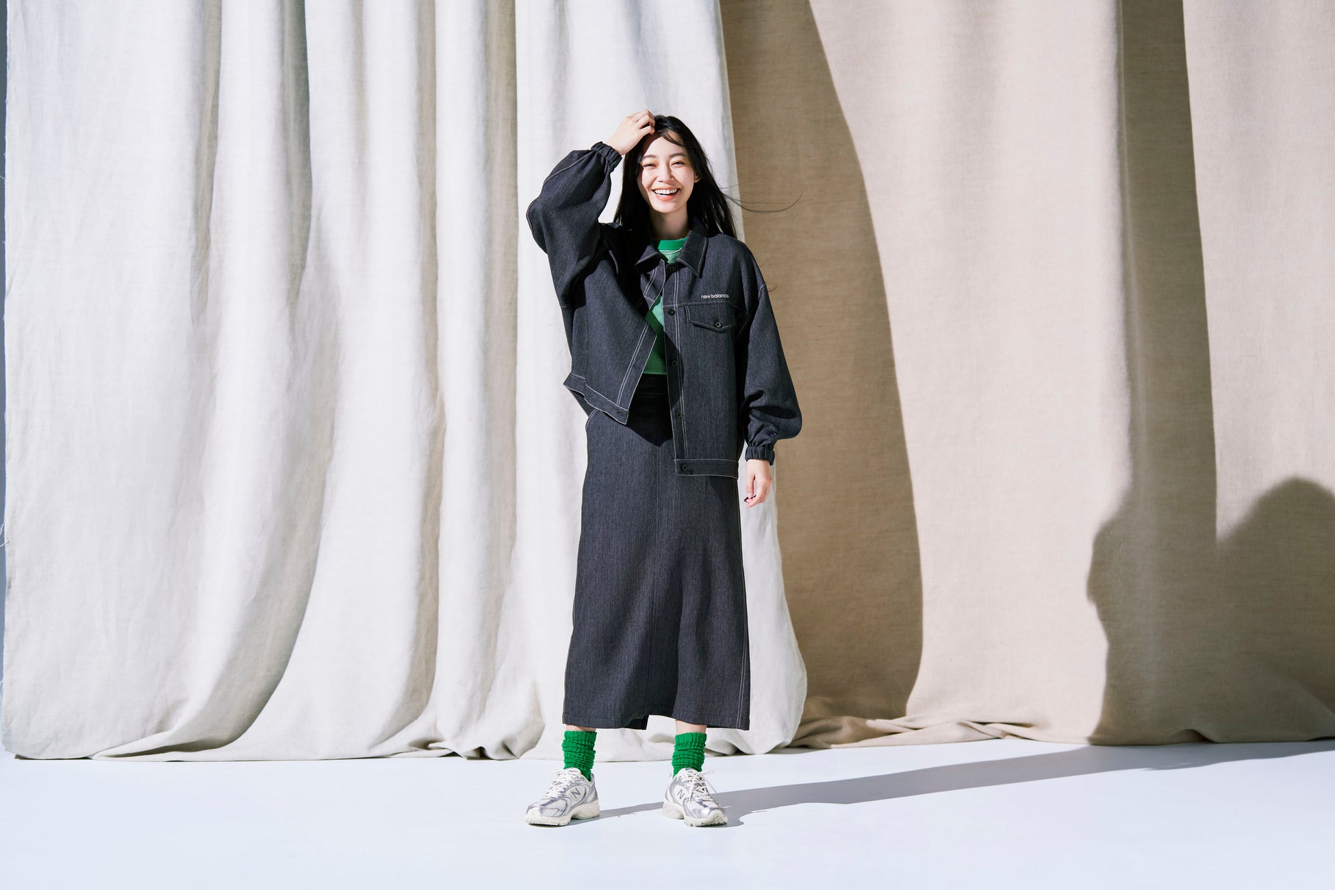 気負わず着られる、春のデニムスタイルです。ジャケットは動きやすく着回し力抜群の定番カラーで、 春の外出時の羽織りとして大活躍。セットアップのスカートは、総ゴム仕様とドローコードによりスムーズな着脱を実現しました。