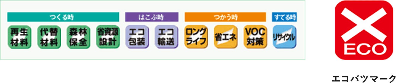 コクヨでは「2008年版総合カタログ」から商品のライフサイクルの各段階(「つくる時」 「はこぶ時」「つかう時」「すてる時」)において、そのいずれかひとつでも環境配慮が十分でない自社商品について、「エコバツマーク」を表記し、それを3年間でゼロにする取り組みを行い「2011年版総合カタログ」で「エコバツゼロ」を達成しました。2022年に策定したサステナブル経営指針に基づき、再生プラスチックの配合率を5%引き上げ15%に設定することや、製品重量の80%以上を一般的な工具でリサイクル可能な状態に分離できることなど、製品特性に合わせてより環境への配慮を高めた新基準を設け、本年発売予定の新製品から順次取り入れていく予定です。