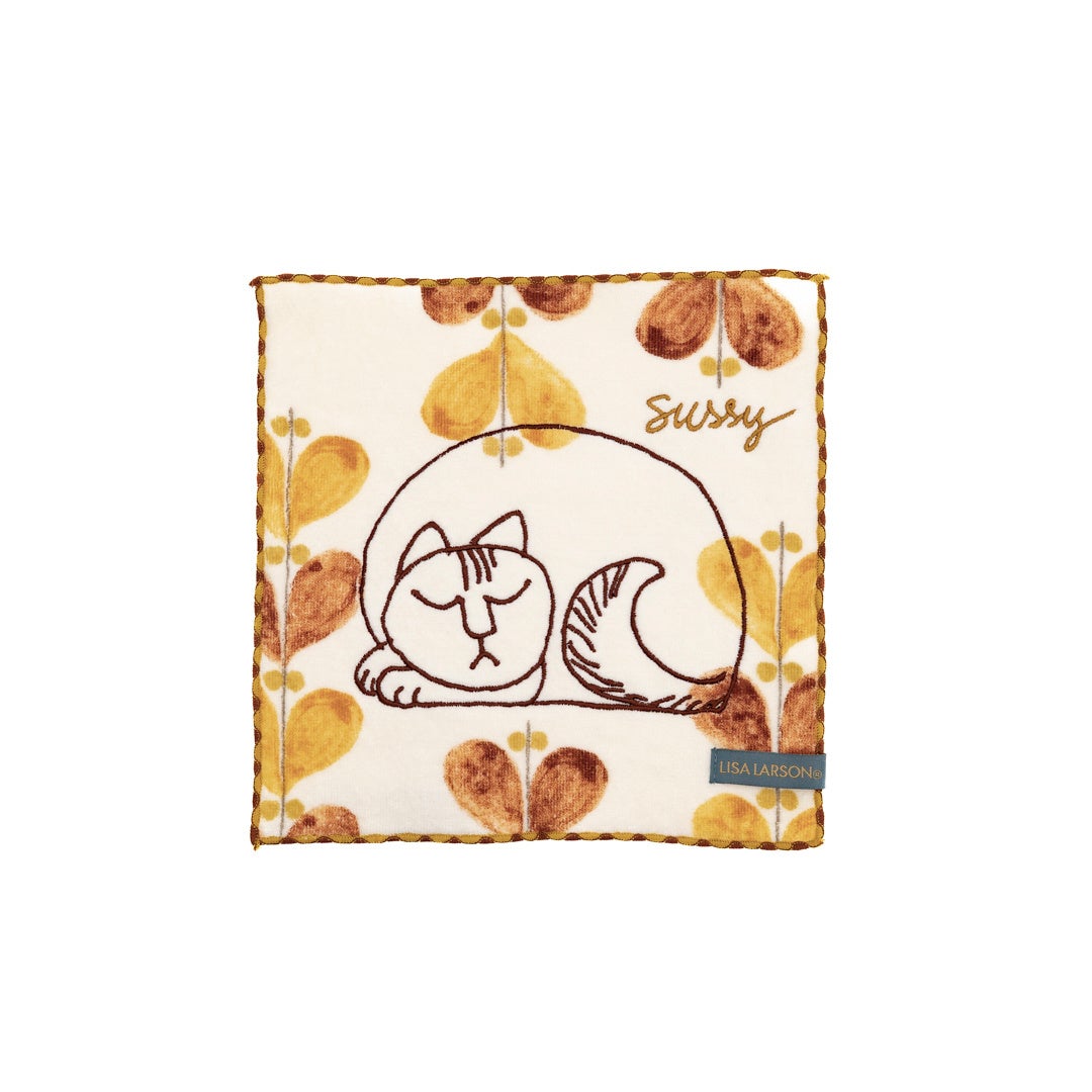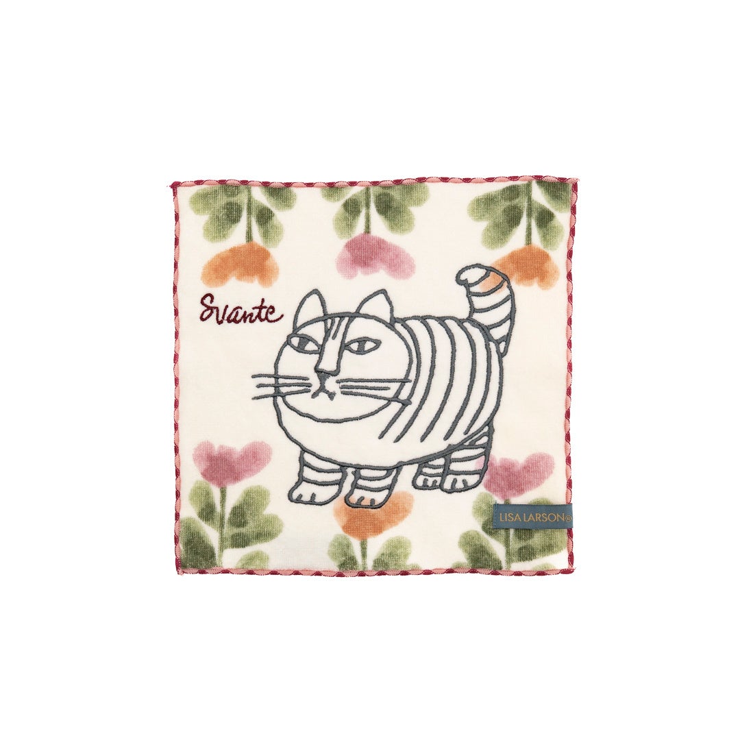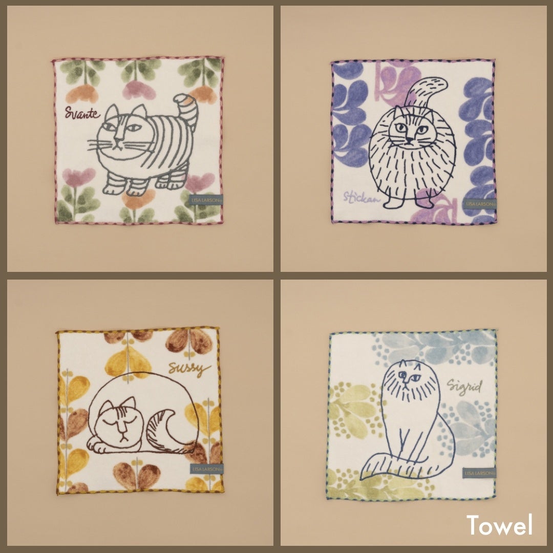 水彩タッチのアートに、刺繍で描かれたスケッチねこたちのミニタオル。贈り物にもぴったりのシリーズです。
